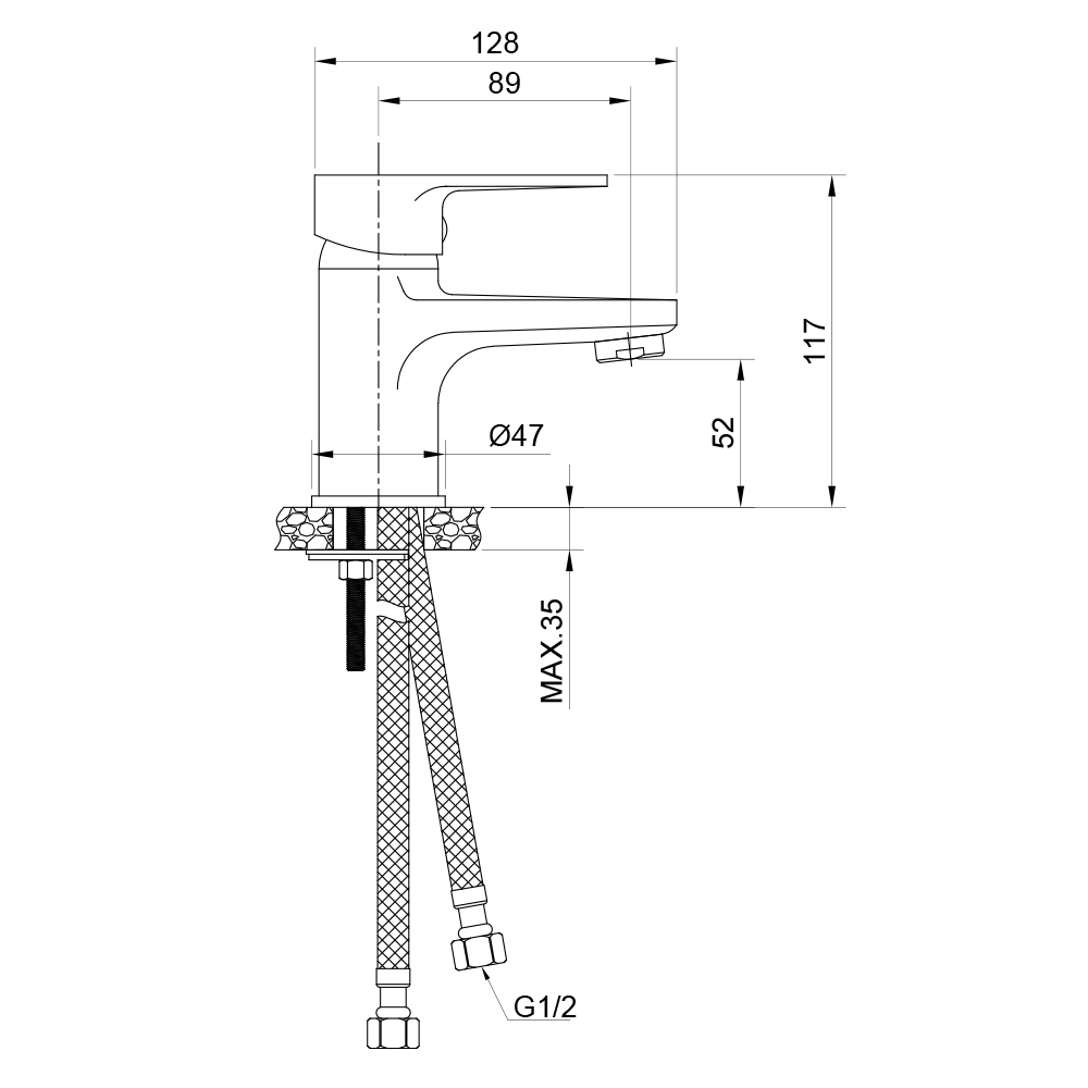 Материал: латунь. Покрытие: Mirror Shine. Цвет: хром. Керамический картридж 35 мм c противошумной вставкой. Эко аэратор. Гибкая подводка EPDM в оплетке из нержавеющей стали 1/2" 40 см. Латунный пьедестал. Крепеж