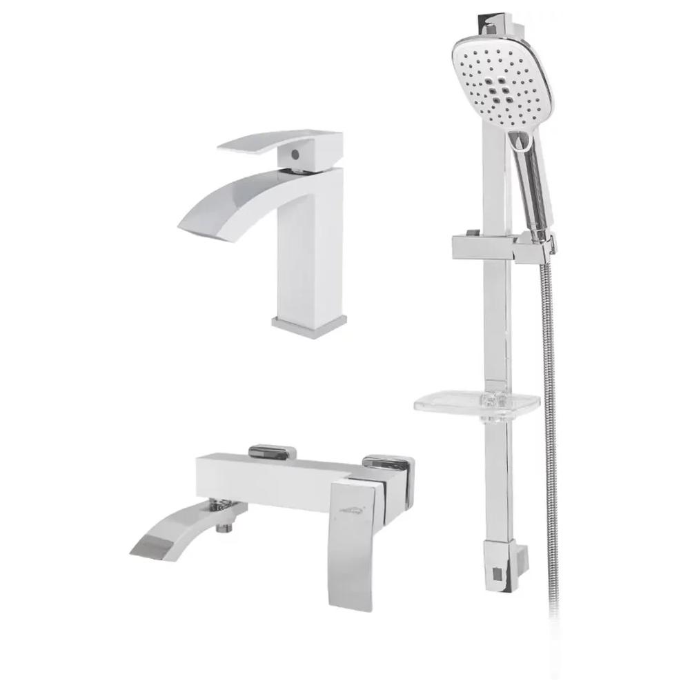 смеситель для раковины, смесителья для ванны, штанга для душа с держателем лейки, душевая лейка, шланг для душа