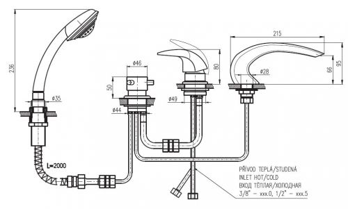 Rav Slezak Dunaj D472.5P каскадный смеситель для ванны. Врезной на 4 отверстия. В состав комплекта входит: переключатель керамический MD0448.5 и душевой шланг с пружиной. Монтаж на борт ванны и плиточный бортик.