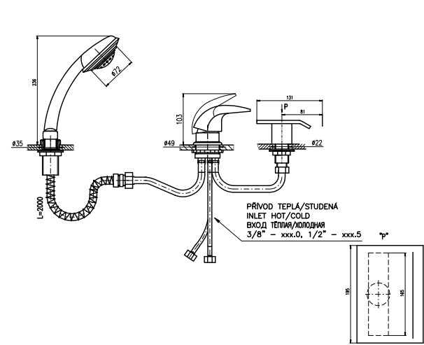 Rav Slezak Dunaj D474.5Y каскадный смеситель для ванны. Врезной на 3 отверстия. В состав комплекта входит: керамический переключатель в миксе ручки, картридж 40 мм, душевой шланг с пружиной, душевая лейка, гибкая подводка 1/2.