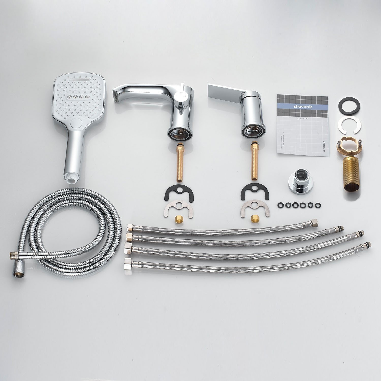 смеситель,излив с переключателем потоков, лейка, шланг, держатель лейки, гибкая подводка, комплект креплений