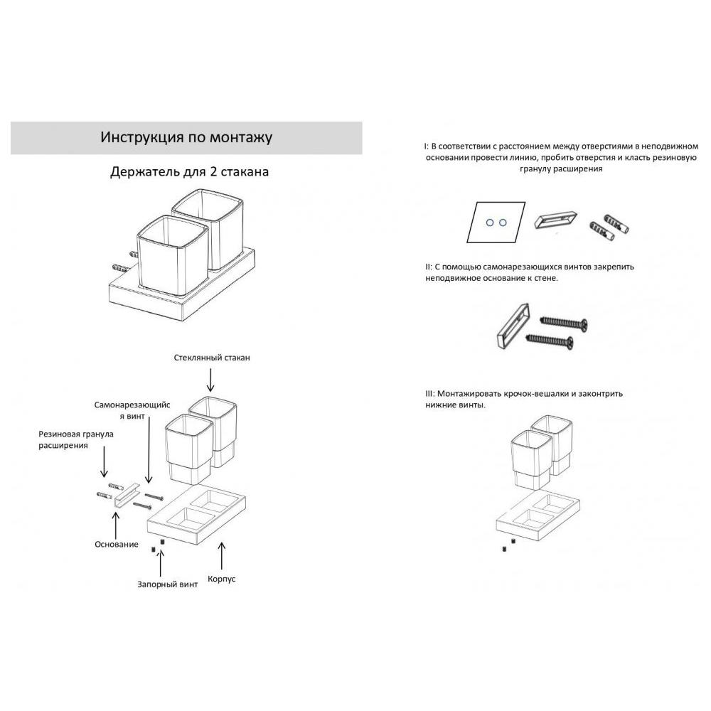 Объем стакана - 250 мл. Держатель изготовлен из высококачественной нержавеющей стали, с надежным покрытием. Держатель крепится к стене на шурупы (входят в комплект поставки).
