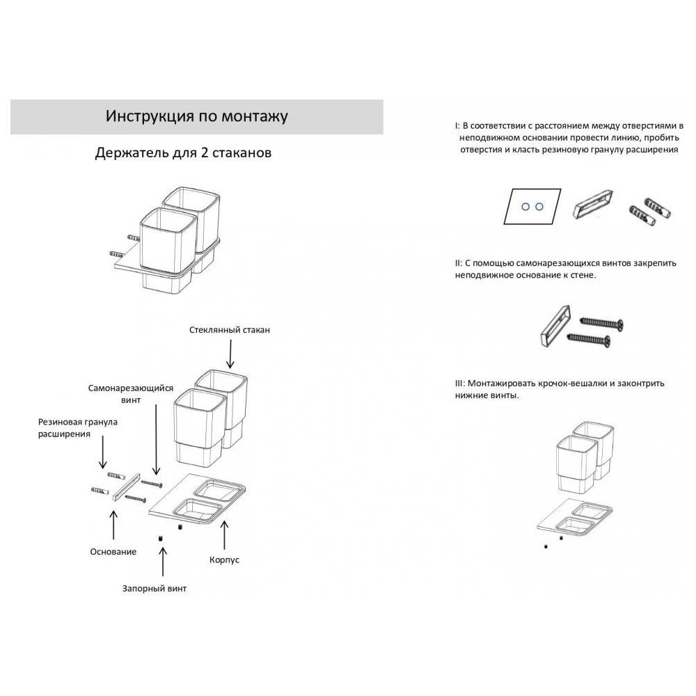 Объем стакана - 250 мл. Держатель изготовлен из высококачественной нержавеющей стали, с надежным покрытием. Держатель крепится к стене на шурупы (входят в комплект поставки).