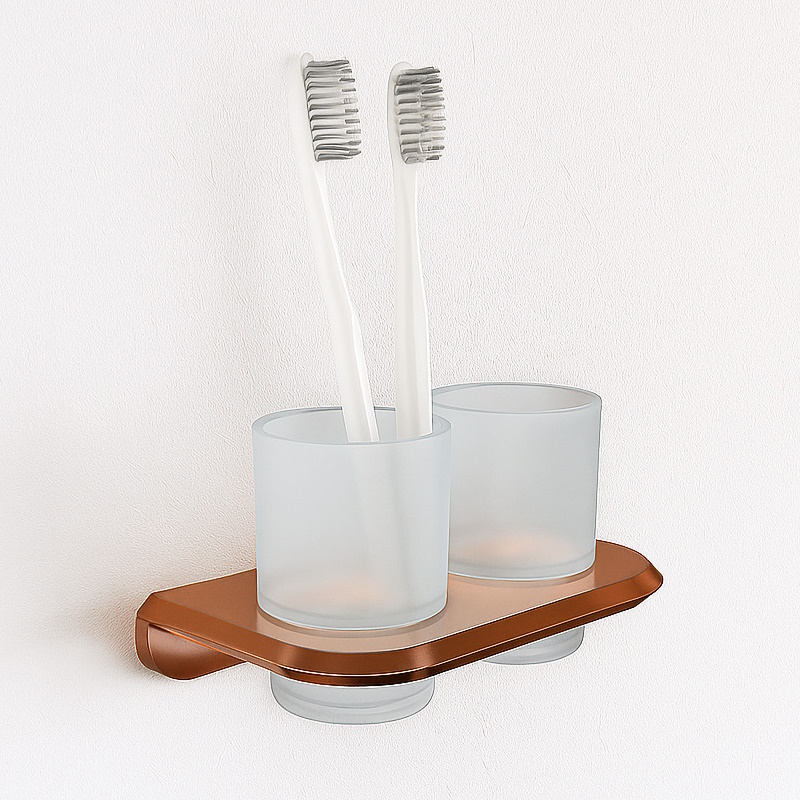 Двойной подвесной стакан SPACE в бронзовом оттенке с матовым стеклом сочетает комфорт и стиль. Настенное крепление экономит место, корпус ZAMAK + SUS-201 с антиследовым покрытием прост в уходе.