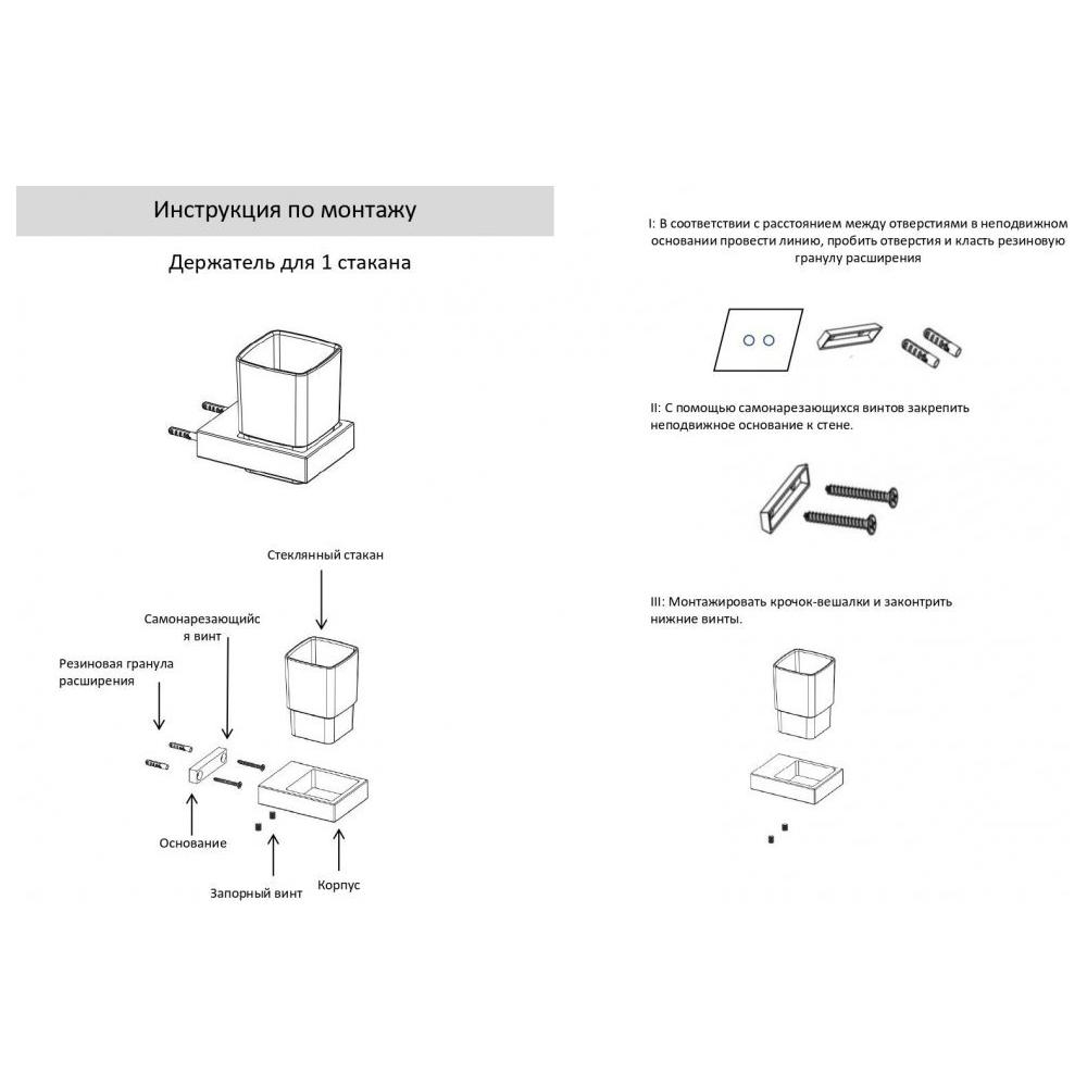 Объем стакана - 250 мл. Держатель изготовлен из высококачественной нержавеющей стали, с надежным покрытием. Держатель крепится к стене на шурупы (входят в комплект поставки).
