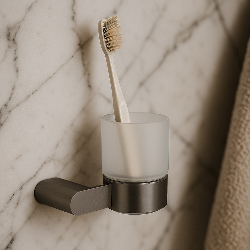 Стильный подвесной стакан BLISS в отделке «оружейная сталь». Настенное крепление делает интерьер аккуратным, а корпус из SUS 304 с антиследовым покрытием гарантирует надежность и легкий уход.