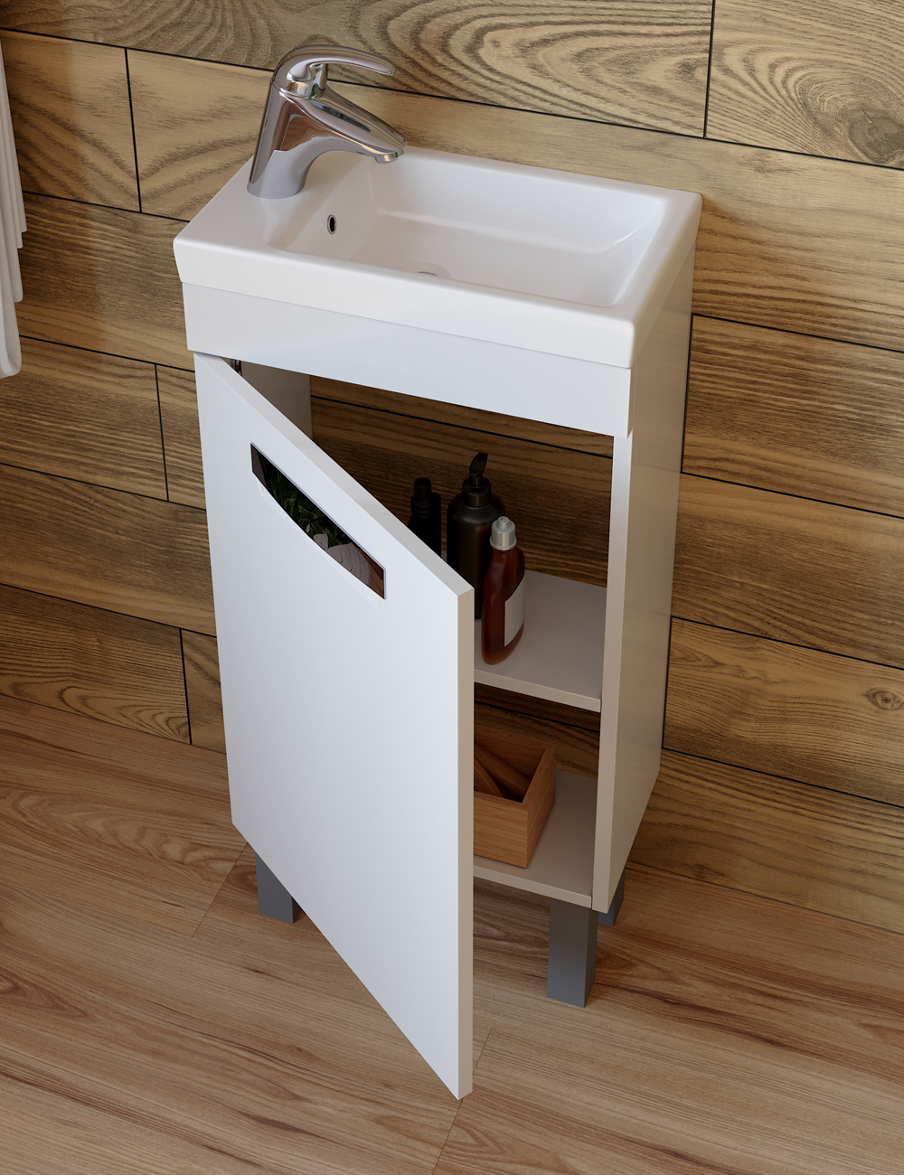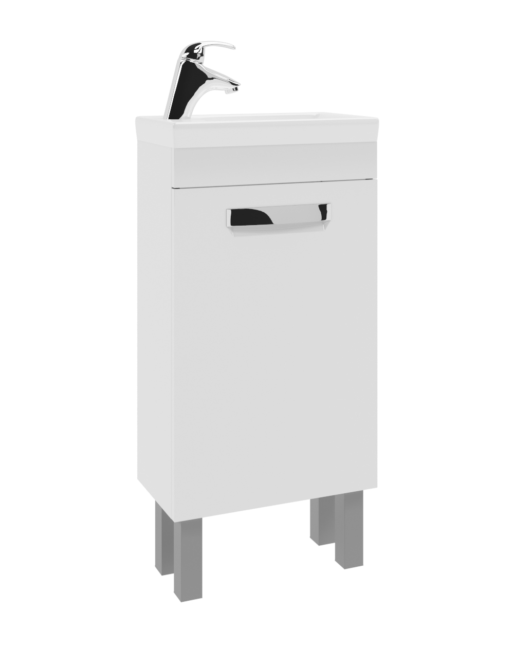Тумба с раковиной напольная VIGO Plaza tn.PLA.MIR.40.1D, 40 см. Раковина в комплекте. 1 дверца; 1 полка ЛДСП; ручка врезная металлическая хромированная, опоры квадратные регулируемые. Материал корпуса: влагостойкая ЛДСП Материал фасадов: ЛМДФ Покрытие: пленка ПВХ Дверцы: петли с механизмом плавного закрывания Ящики: скрытые направляющие полного выдвижения, механизм мягкого бесшумного самозакрывания. (Hettich,Германия).