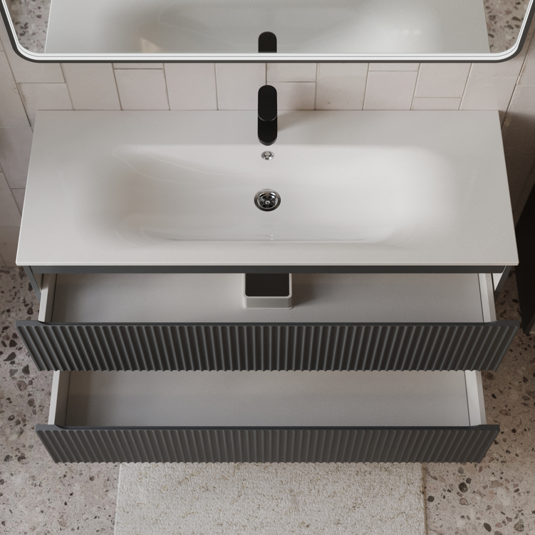 Тумба с раковиной подвесная (120см) Terminus Sicilia SIC101202701601O, графит . Раковина из литьевого мрамора в комплекте: диаметр отверстия под смеситель: 35, диаметр отверстия слива: 45 мм, диаметр отверстия перелива: 30 мм. Ширина тумбы: 1200 мм. Тип фасада: Волнообразная фрезеровка . Материал ящиков: ДСП. Количество ящиков: 2. Сифон и данный клапан приобретаются отдельно и в комплект поставки не входят. В тумбе установлена фурнитура Firmax. Система открывания: Фрезерованные ручки. Технология направляющих: Soft-Close, полного выдвижения, с доводчиком. Тумба поставляется в сборе. Гарантийный срок 2 года.