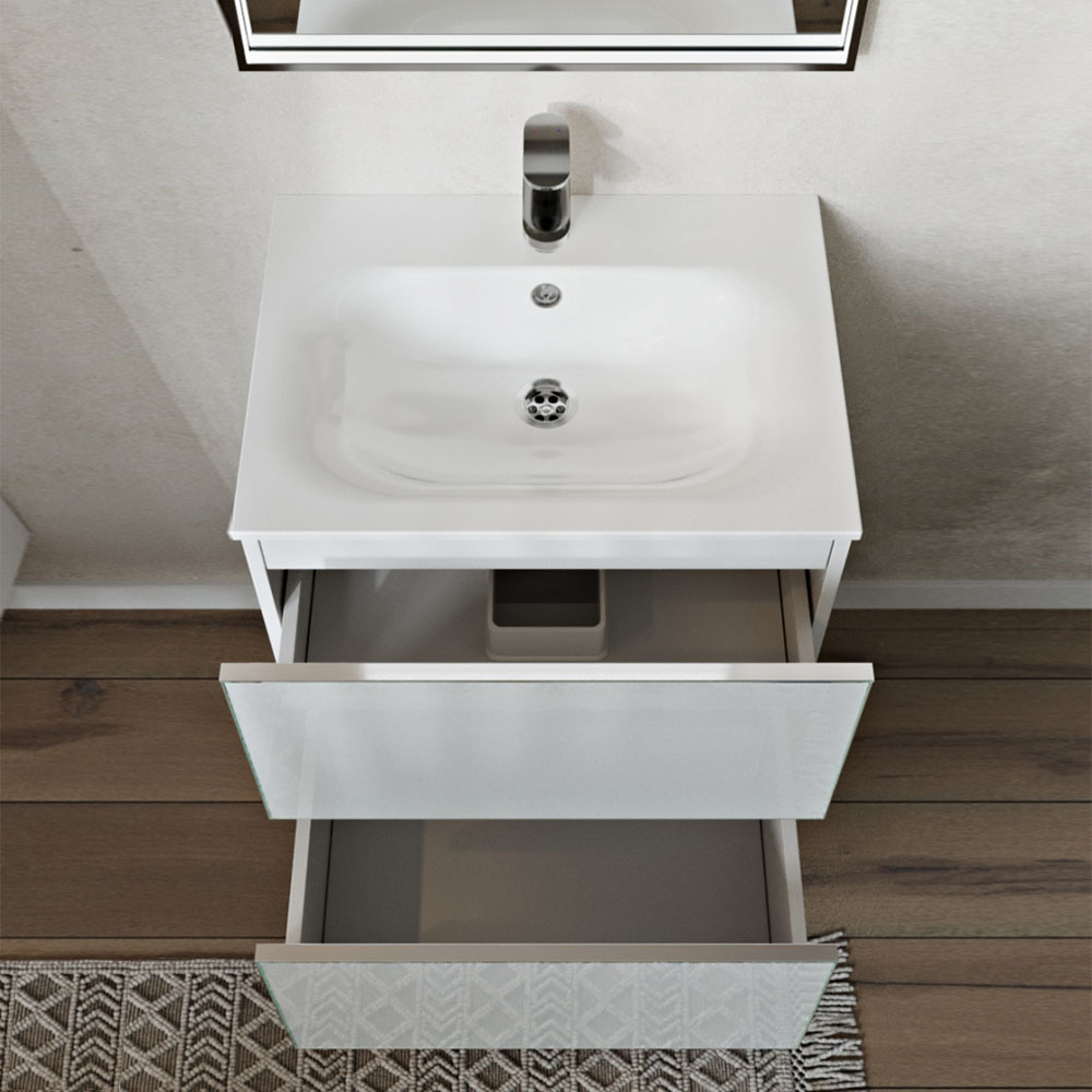 Тумба с раковиной подвесная (60см) Terminus Vega VEG10602900301OSL, белый. Раковина из литьевого мрамора в комплекте: диаметр отверстия под смеситель: 35 мм, диаметр отверстия слива: 45 мм, диаметр отверстия перелива: 30 мм. Ширина тумбы: 600 мм. Тип фасада: Стекло в профиле. Материал ящиков: ДСП. Количество ящиков: 2. Сифон и донный клапан приобретаются отдельно и в комплект поставки не входят. В тумбе установлена фурнитура Firmax. Система открывания: Push-to-Open (открытие при нажатии). Технология направляющих: Soft-Close, полного выдвижения, с доводчиком. Тумба поставляется в сборе. Гарантийный срок 2 года.