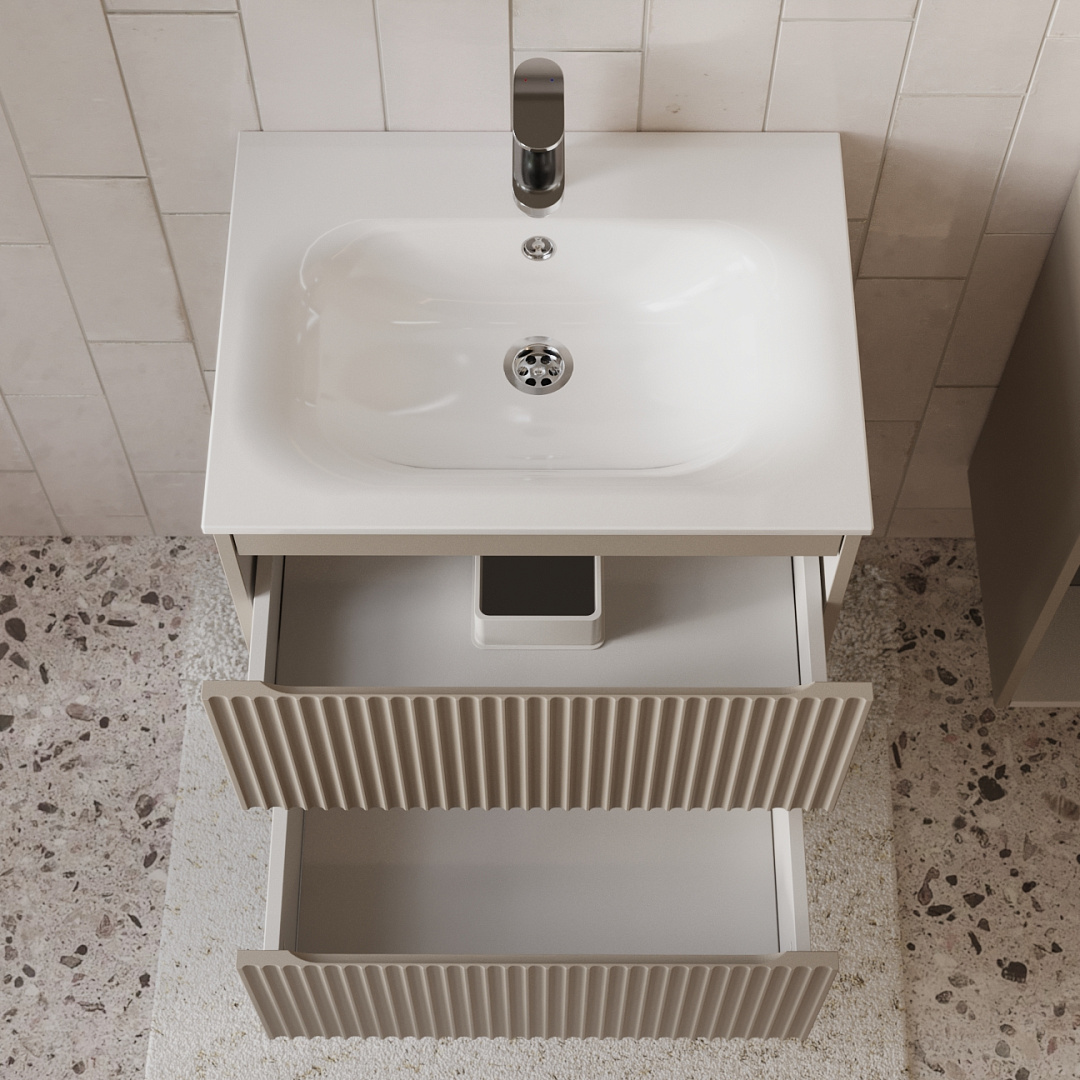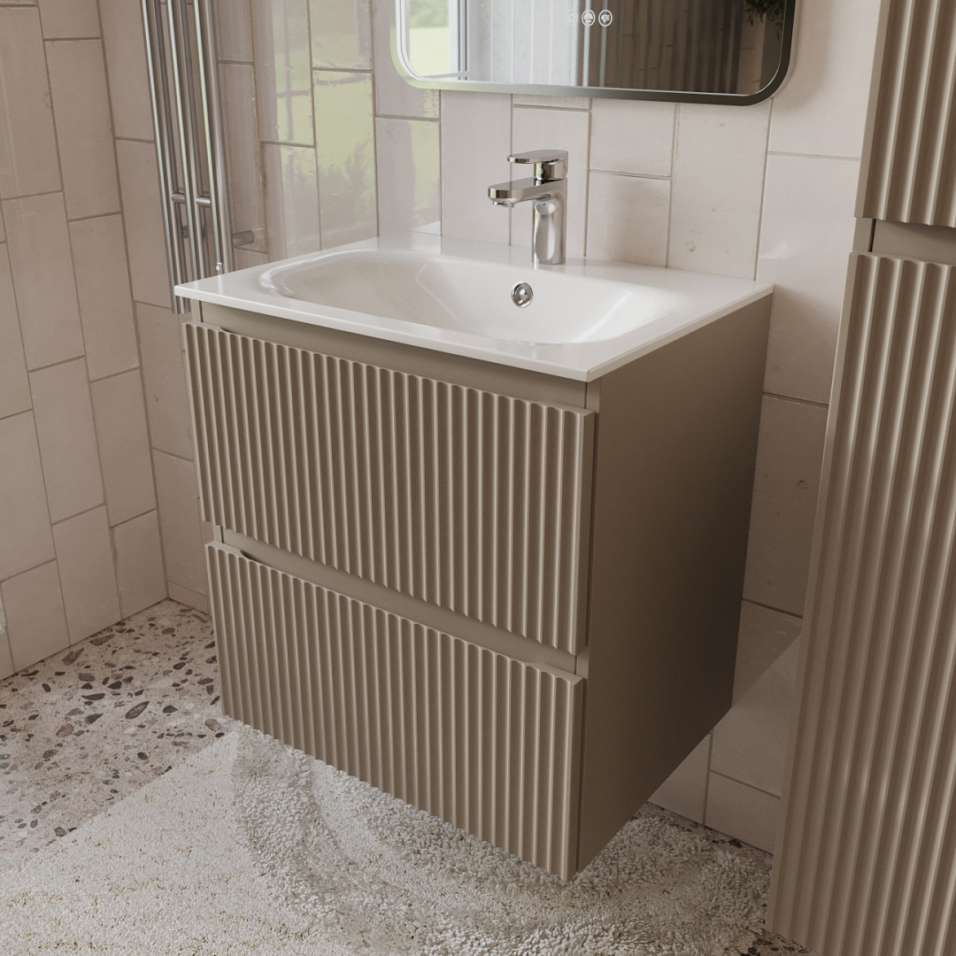Тумба с раковиной подвесная (80см) Terminus Sicilia SIC10602200501O, капучино. Раковина из литьевого мрамора в комплекте: диаметр отверстия под смеситель: 35, диаметр отверстия слива: 45 мм, диаметр отверстия перелива: 30 мм. Ширина тумбы: 600 мм. Тип фасада: Волнообразная фрезеровка . Материал ящиков: ДСП. Количество ящиков: 2. Сифон и данный клапан приобретаются отдельно и в комплект поставки не входят. В тумбе установлена фурнитура Firmax. Система открывания: Фрезерованные ручки. Технология направляющих: Soft-Close, полного выдвижения, с доводчиком. Тумба поставляется в сборе. Гарантийный срок 2 года.