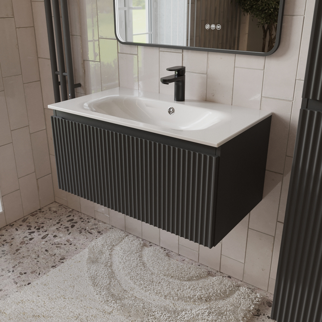 Тумба с раковиной подвесная (80см) Terminus Sicilia SIC10801701601O, графит . Раковина из литьевого мрамора в комплекте: диаметр отверстия под смеситель: 35, диаметр отверстия слива: 45 мм, диаметр отверстия перелива: 30 мм. Ширина тумбы: 800 мм. Тип фасада: Волнообразная фрезеровка . Материал ящиков: ДСП. Количество ящиков: 1. Сифон и данный клапан приобретаются отдельно и в комплект поставки не входят. В тумбе установлена фурнитура Firmax. Система открывания: Фрезерованные ручки. Технология направляющих: Soft-Close, полного выдвижения, с доводчиком. Тумба поставляется в сборе. Гарантийный срок 2 года.