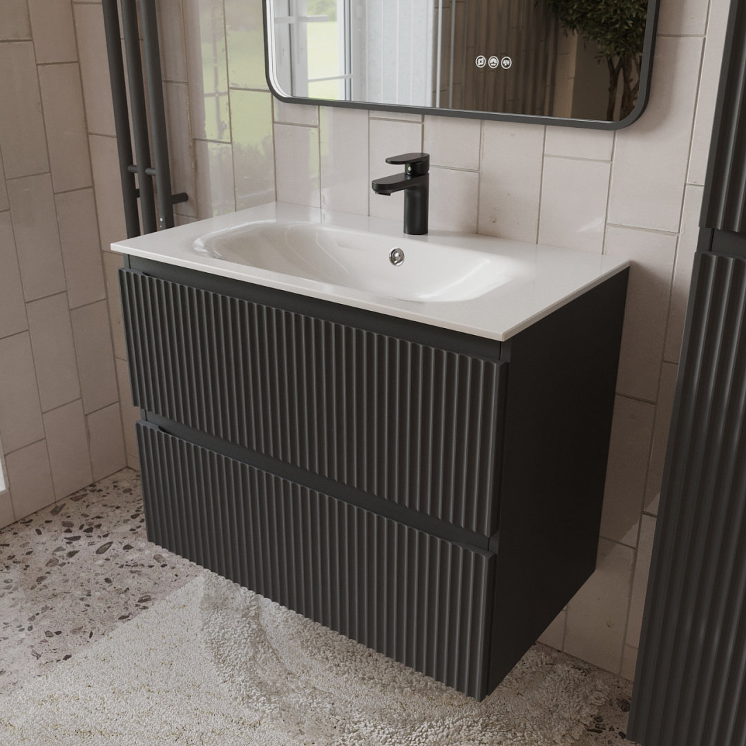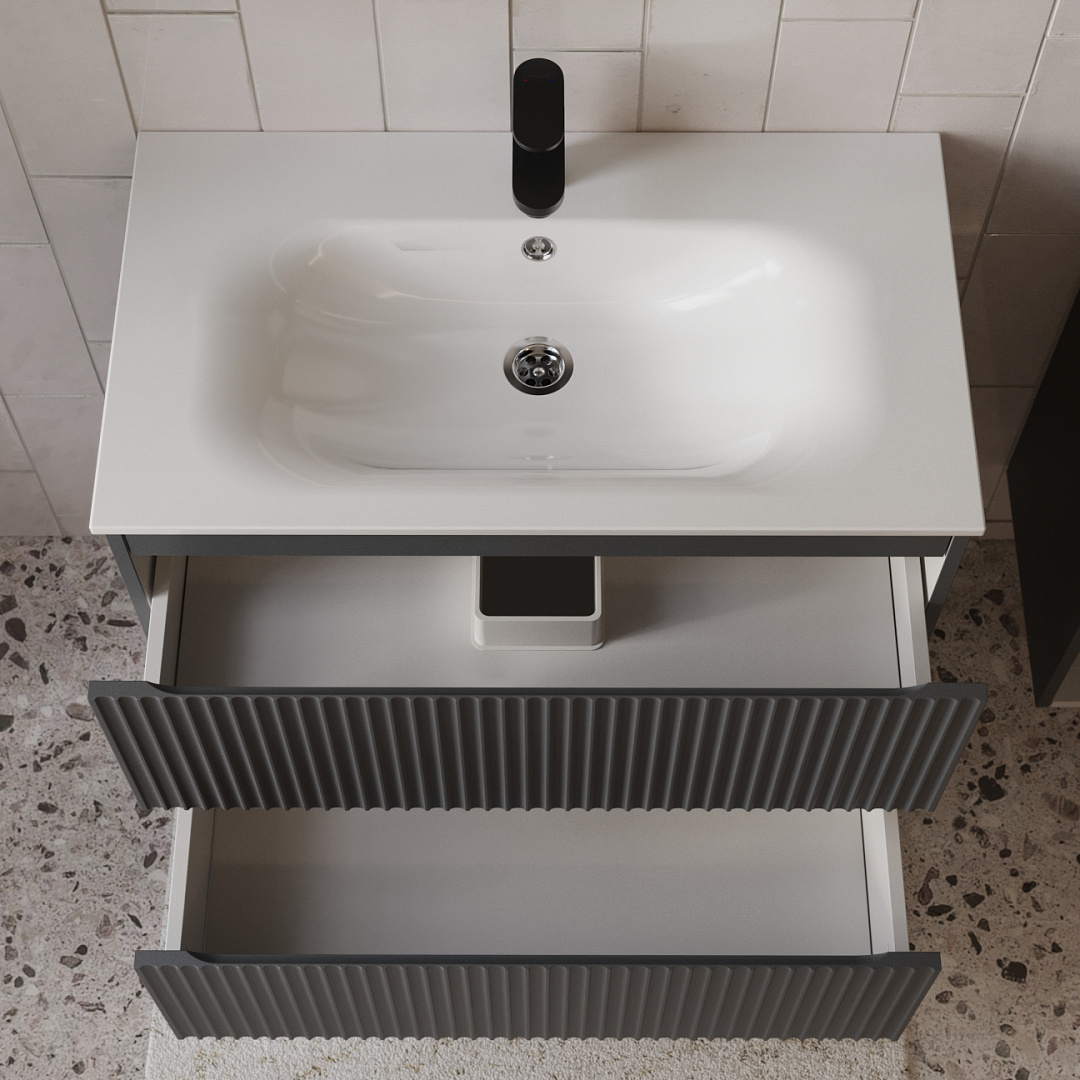 Тумба с раковиной подвесная (80см) Terminus Sicilia SIC10802701601O, графит . Раковина из литьевого мрамора в комплекте: диаметр отверстия под смеситель: 35, диаметр отверстия слива: 45 мм, диаметр отверстия перелива: 30 мм. Ширина тумбы: 800 мм. Тип фасада: Волнообразная фрезеровка . Материал ящиков: ДСП. Количество ящиков: 2. Сифон и данный клапан приобретаются отдельно и в комплект поставки не входят. В тумбе установлена фурнитура Firmax. Система открывания: Фрезерованные ручки. Технология направляющих: Soft-Close, полного выдвижения, с доводчиком. Тумба поставляется в сборе. Гарантийный срок 2 года.