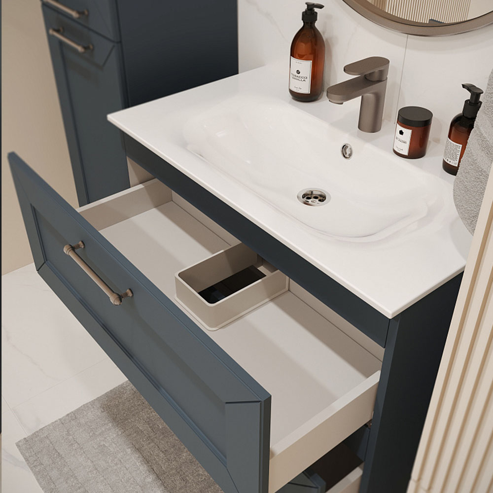 Тумба с раковиной подвесная (80см) Terminus Victoria VIC10802703101O, серый шёлк. Раковина из литьевого мрамора в комплекте: диаметр отверстия под смеситель: 35, диаметр отверстия слива: 45 мм, диаметр отверстия перелива: 30 мм. Ширина тумбы: 800 мм. Тип фасада: Филенчатая фрезеровка . Материал ящиков: ДСП. Количество ящиков: 2. Сифон и данный клапан приобретаются отдельно и в комплект поставки не входят. В тумбе установлена фурнитура Firmax. Система открывания: Металлические ручки . Технология направляющих: Soft-Close, полного выдвижения, с доводчиком. Тумба поставляется в сборе. Гарантийный срок 2 года.
