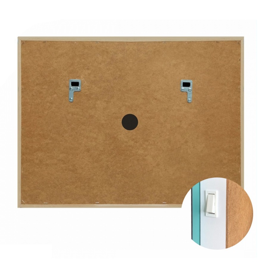 Корпус изделия изготовлен из МДФ в плёнке ПВХ, а фасад - из зеркального полотна крупнейшей японской корпорации AGC. Корпус не заметен за фасадом. По периметру корпуса крепится светодиодная лента, скрытая крышкой корпуса и дающая мягкий и ровный свет, исходящий от светящейся полосы шириной 2.5 см вдоль всей кромки.