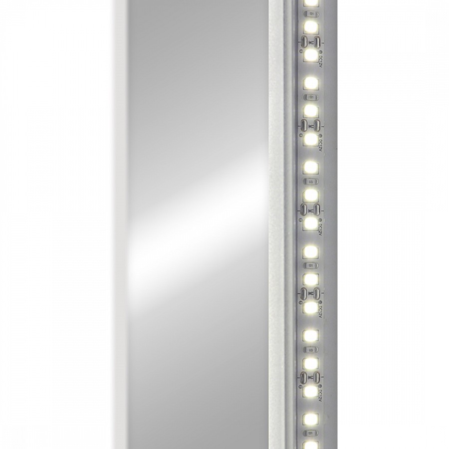 Корпус изделия изготовлен из МДФ и пластика, а фасад - из зеркала, обрамлённого в рамку из МДФ с плёнкой ПВХ белого цвета. По периметру корпуса за фасадом крепится светодиодная лента, дающая эффектное мягкое освещение.