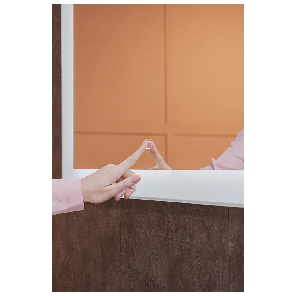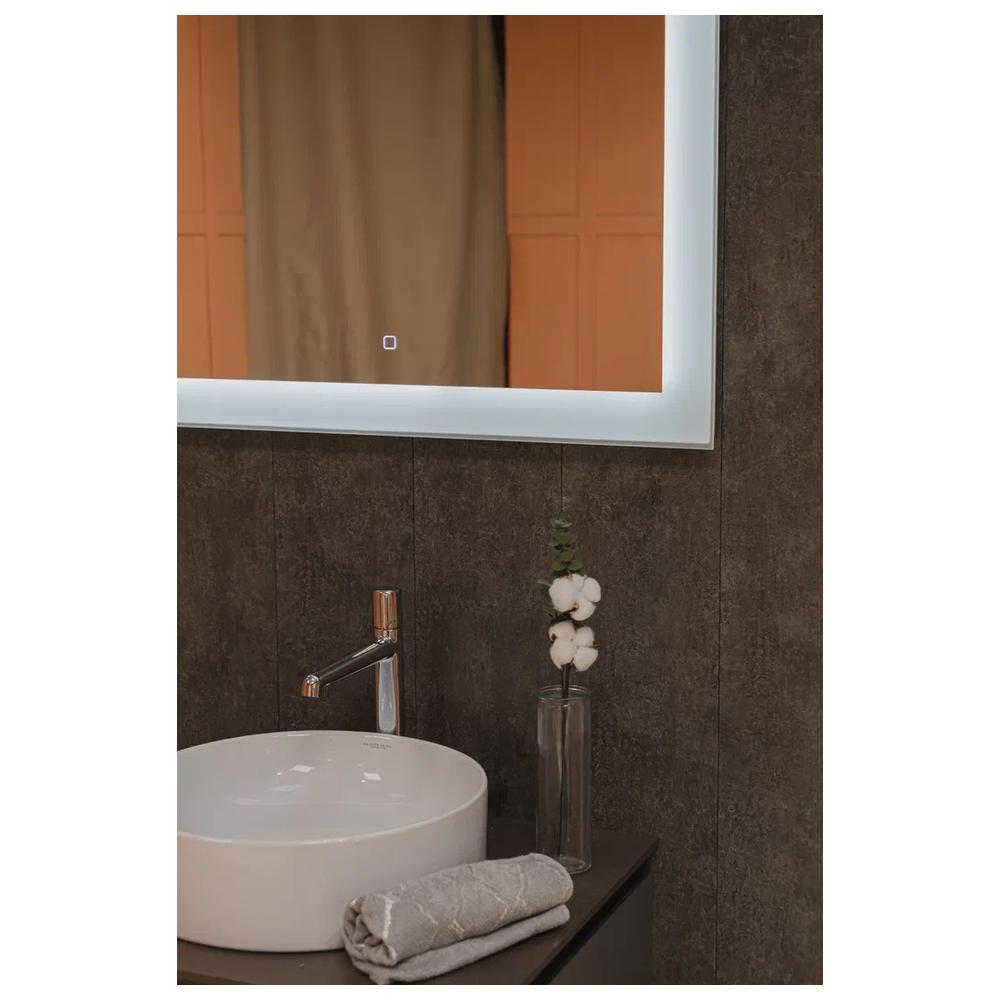 "Норма" 800х600 (сенсорный выключатель) зеркало. В каждой линии этого минималистичного прямоугольного зеркала ощущаются стиль и функциональность. Лаконичный рисунок по периметру с LED-подсветкой создаёт иллюзию широкой, но лёгкой светлой рамы. Благодаря этому зеркало воспринимается как окно, добавляет пространству света и воздуха, сбалансирует тёмный интерьер. При этом оно не перетягивает на себя излишнее внимание, вносит ощущение гармонии и спокойствия. Модель оценят любители просторных, «чистых» интерьеров, а также красивых, практичных вещей: широкая полоса подсветки, регулируемая сенсорным выключателем с функцией диммера, отвечает за комфорт при нанесении макияжа и совершении других процедур.