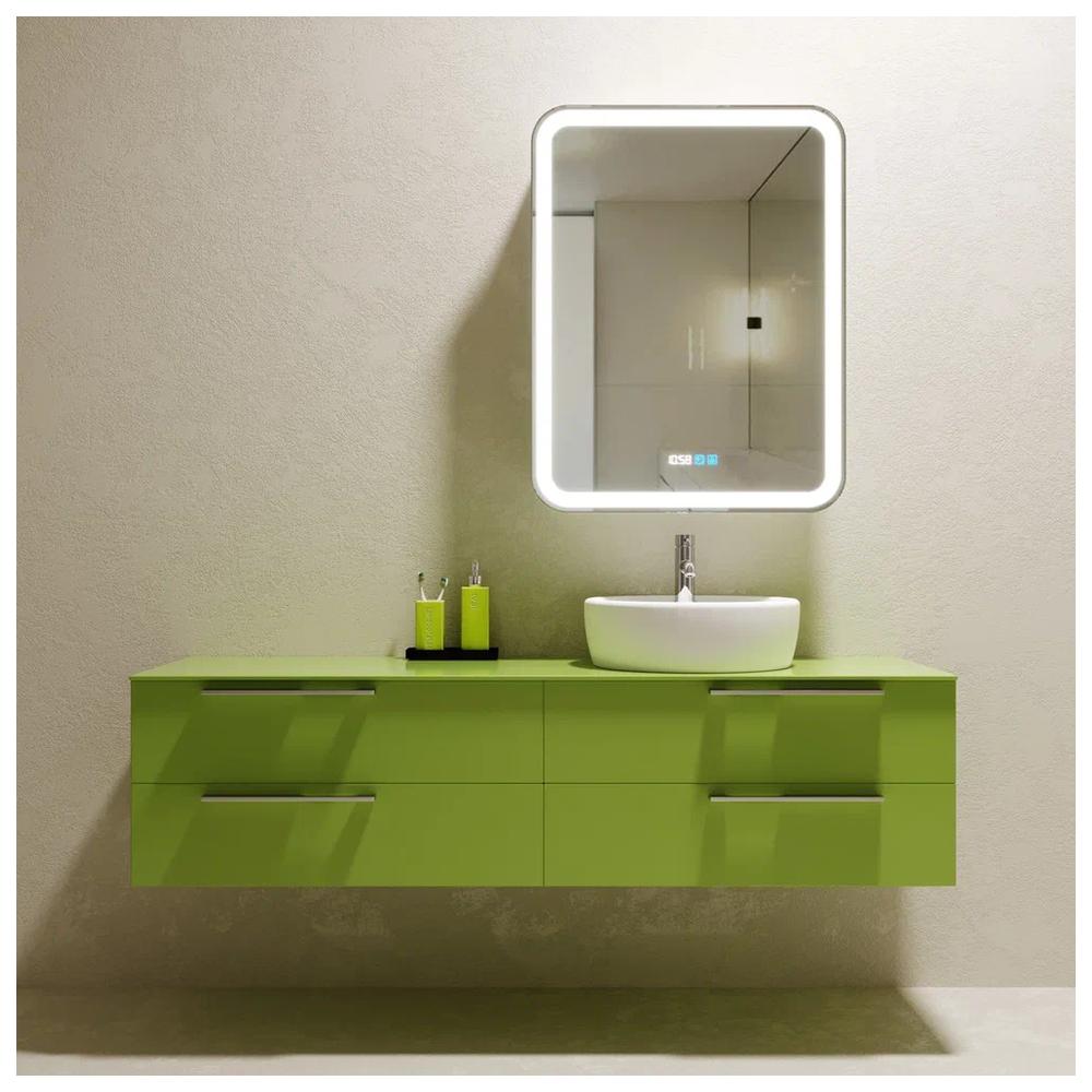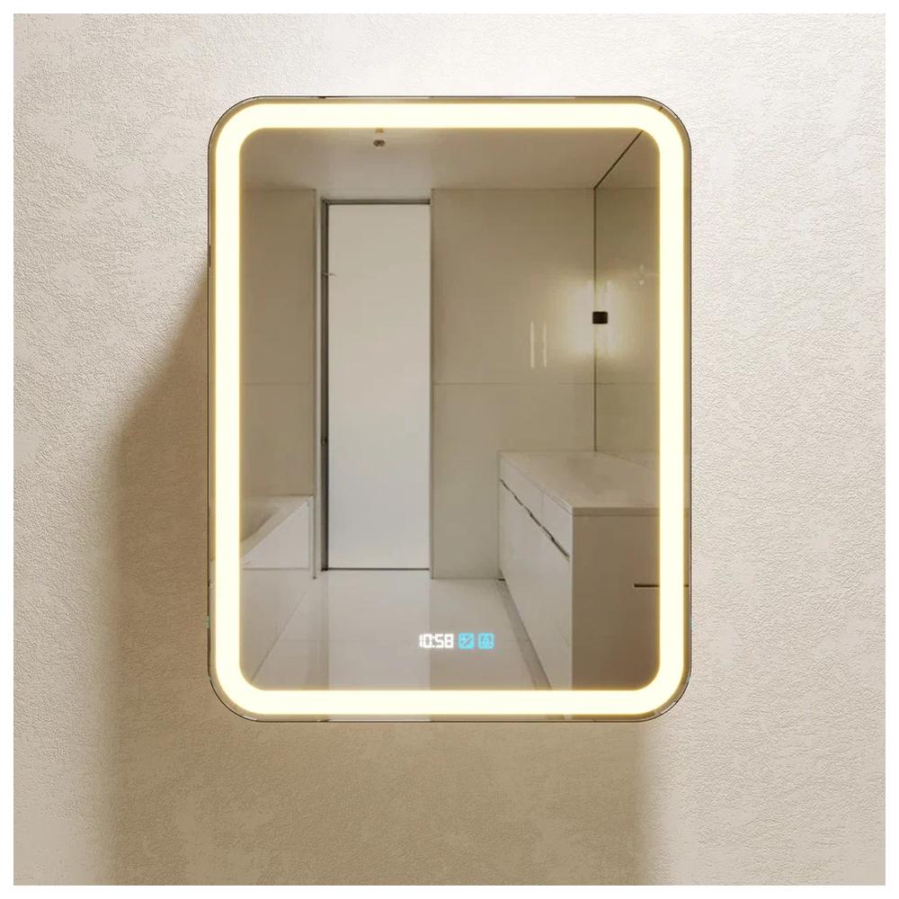 Элегантное зеркало-шкаф с вместительным эргономичным корпусом. Позволяет эффективно использовать пространство ванной комнаты. Быстросъёмные петли дверцы снабжены доводчиком для плавного закрывания, две стеклянные полочки — с безопасной полированной кромкой и фиксаторами, розетка — в боковой части корпуса. Монолитное влагостойкое зеркальное полотно, оснащённое часами и датчиком температуры, полностью скрывает зону хранения. Подогрев полотна исключает запотевание. LED-подсветка обеспечивает направленное освещение лица без теней и бликов. Управляется сенсорным выключателем. Функция смены температуры подсветки позволяет выбрать один из 3-х режимов свечения (тёплый, нейтральный, холодный), функция диммера — плавно отрегулировать яркость. Функция памяти предназначена для запоминания последней настройки яркости.