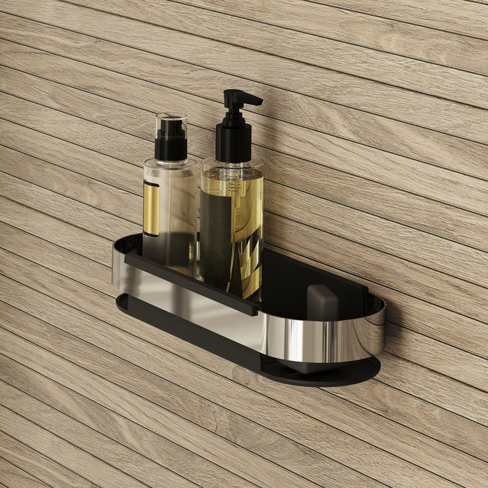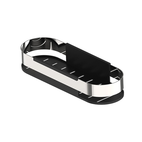 Овальная полка для ванной комнаты размером 300х128 мм вместит все необходимое для комфортного принятия душа. Внутри полки размещен гигиеничный короб – съемная вставка из прочного ABS-пластика в цвет внешнего корпуса, которая легко вытаскивается и моется, не ржавеет и не деформируется, не впитывает запахи. Изделие выполнено в трендовом черном цвете и станет ярким акцентом в любом интерьере.