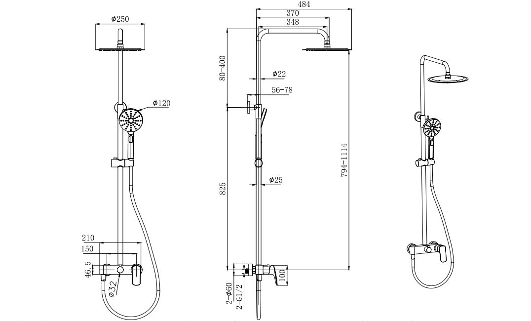 Душевая система AQUATEK AQ2060MB, 3jet 250мм, матовый черный
