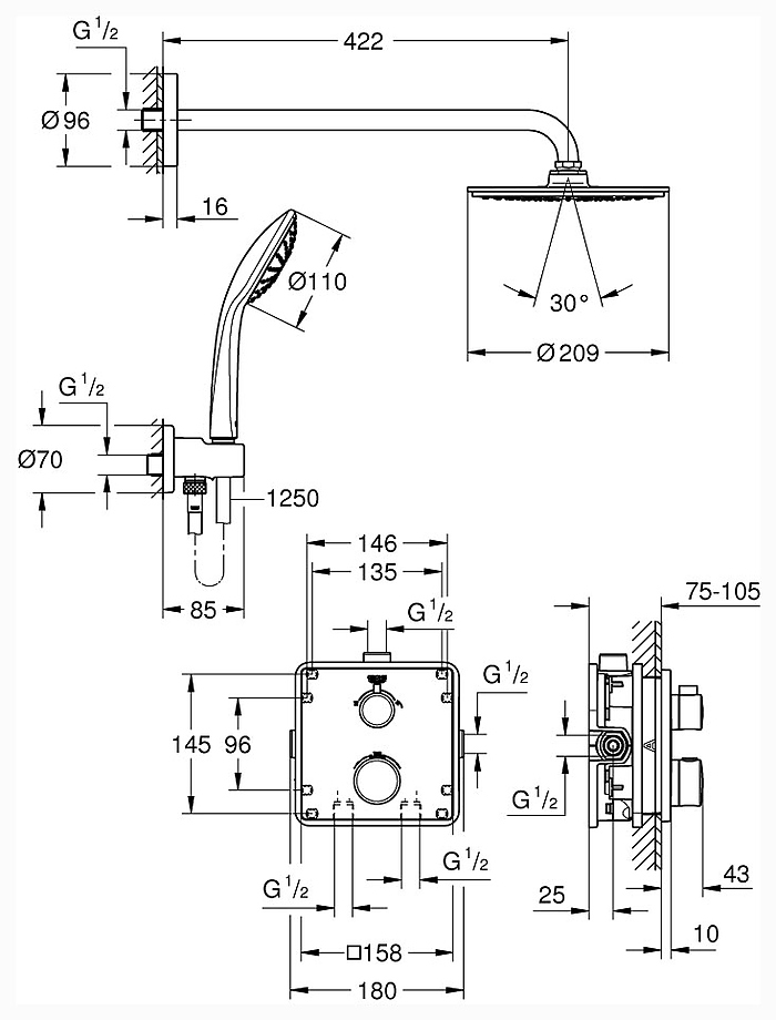 Душевая система с термостатом встроенным Grohe Grohtherm хром (34734000)