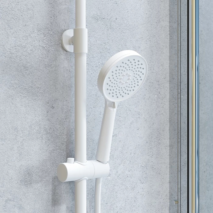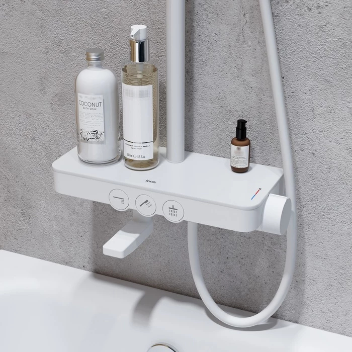 Смеситель для ванны Shefy – мечты о будущем доступные уже сегодня! Смеситель обращает на себя внимание дизайнерским корпусом с декоративными элементами из закаленного стекла и продуманным функционалом. Кнопочное управление Push Control – одновременно технологичное и невероятно простое – позволяет осуществлять управление смесителем простым нажатием на кнопки. Смеситель Shelfy в трендовом белом цвете будет созвучен как классическому, так и современному интерьеру. Его поверхность возьмет на себя роль небольшой полочки – на ней будет удобно разместить косметические средства. В комплекте душевые аксессуары в тон смесителя – гладкий шланг из ПВХ (1,5 м), ручная лейка и держатель для лейки.