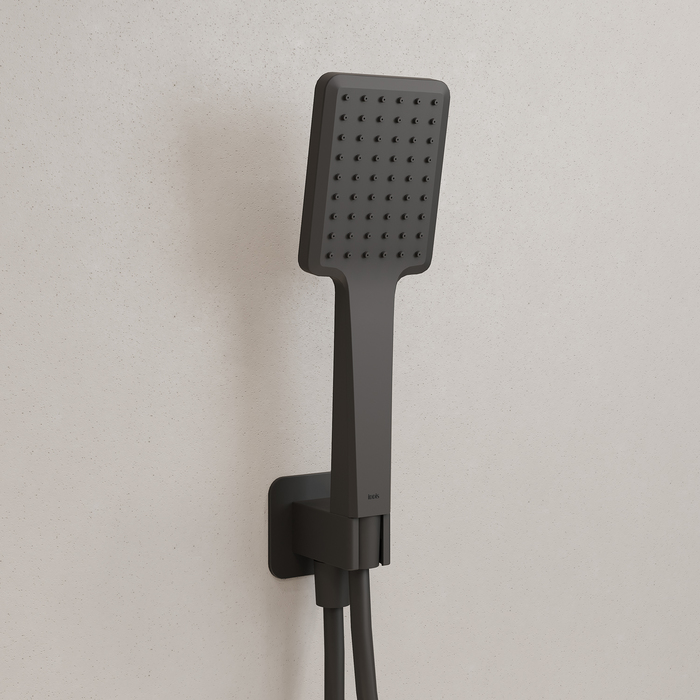 Оптимальная подборка Slide: смеситель, верхняя лейка с кронштейном для тропического душа, излив, ручная лейка, душевой шланг и выход для шланга с держателем для лейки.
