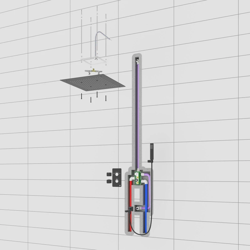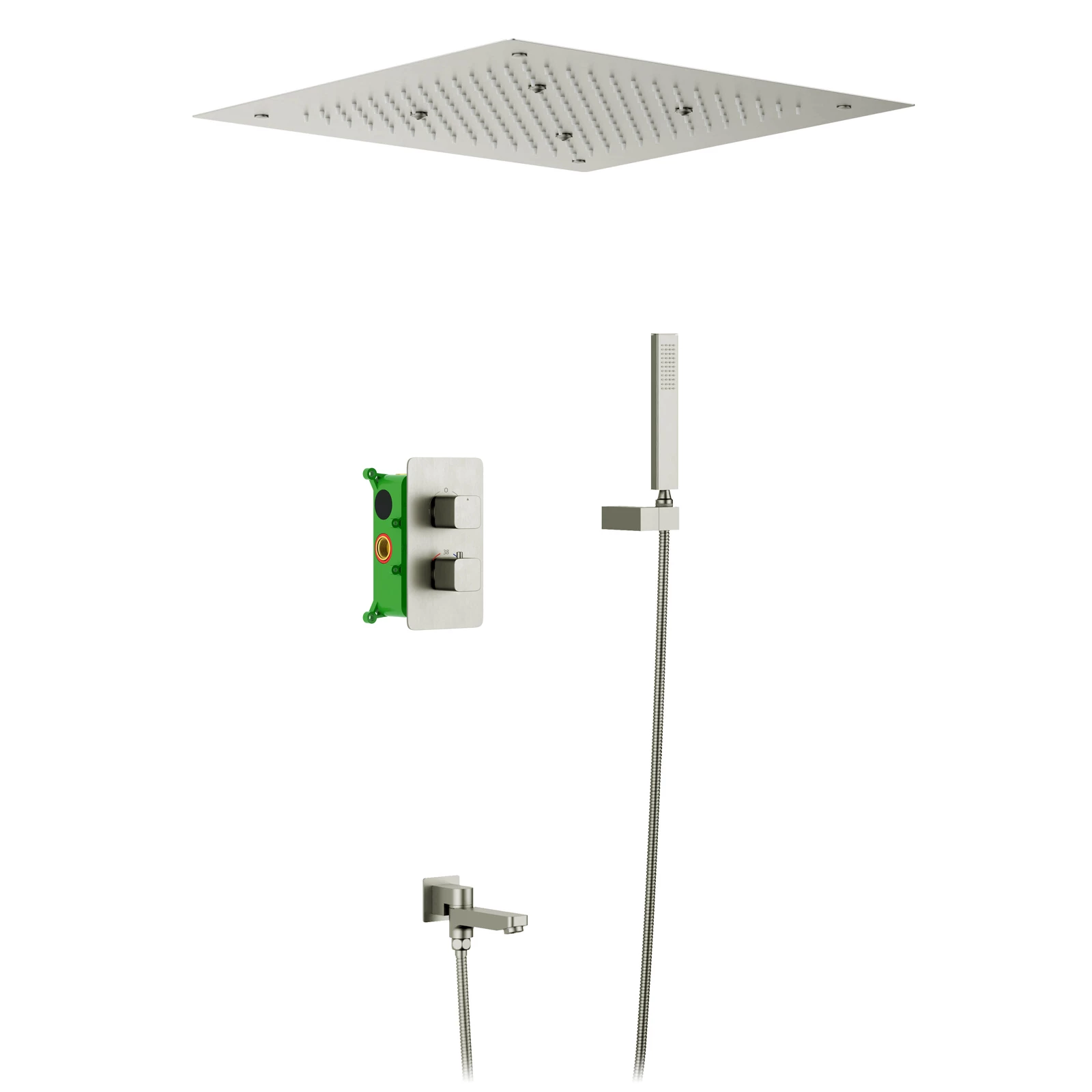 Подводка к тропическому душу - 1 шт. Крепежные винты с гайками (комплект) - 4 шт. Металлическая пластина - 1 шт. Муфты с резьбой - 4 шт. Лейка тропического душа - 1 шт. Крепежные винты - 4 шт. Ручной душ (латунный) - 1 шт. Держатель ручного душа - 1 шт. Шланг душа 1,5 м (латунный) - 1 шт. Встраиваемый блок смесителя - 1 шт. Декоративная накладка (латунная) - 1 шт. Ручка переключения режимов "ручной душ", "тропический душ" - 1 шт. Ручка управления термостатом - 1 шт. Излив с подключением шланга душа (латунный) - 1 шт. Инструкция - 1 шт.
