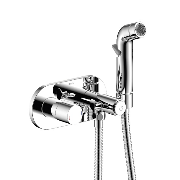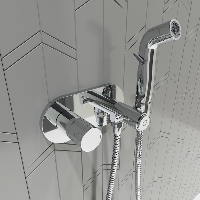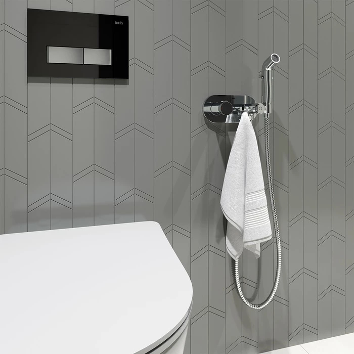 Смеситель из новой коллекции Axes отличается ультрамодным дизайном и продуманным конструктивом – гигиенический душ удобно ложится в руку, а рычажное управление позволяет регулировать напор воды в одно касание. Смеситель запоминает комфортную температуру воды, благодаря этому гигиенические процедуры становятся еще более комфортными. Компактная лейка фиксируется непосредственно в самом смесителе, что экономит пространство, а скрытый монтаж в стену позволяет сохранить эстетичный внешний вид любого современного санузла. Гигиеническая лейка, крючок и душевой шланг (1,5) в металлической оплетке в комплекте.