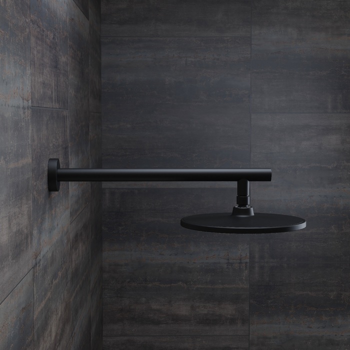 Черный матовый Г-образный настенный кронштейн для верхней душевой лейки. Круглое сечение, длина 400 мм. Совместим с любыми черными верхними лейками IDDIS® с подключением G 1/2, а также с лейками других производителей.