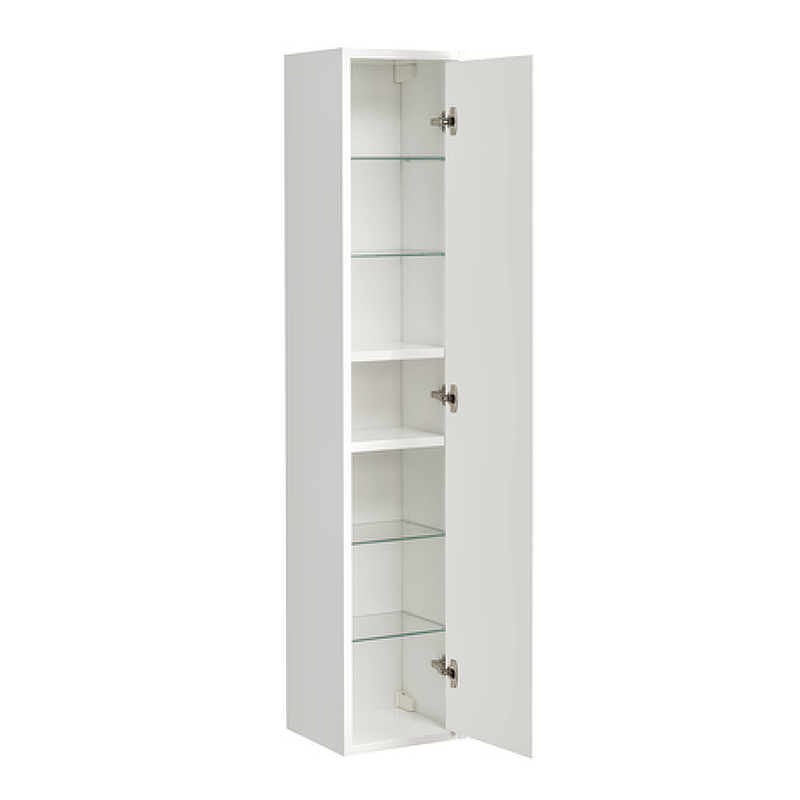 Подвесной шкаф-колонна Римини расширяет пространство ванной комнаты, а его поверхность выглядит невероятно гладкой. Этот эффект достигается благодаря стеклянному полотну, установленному на фасаде и отсутствию на нем фурнитуры. Внутри изделия размещаются регулируемые по высоте стеклянные полки. Фасад колонны выполнен из высококачественной МДФ, а белое глянцевое покрытие корпуса, благодаря полиэфирной краске ультрафиолетового отверждения, позволяет защитить поверхность колонны от внешних воздействий. Может быть использована как в левом, так и в правом исполнении, благодаря опции перевешивания фасадов. Петли с механизмом плавного довода обеспечивают мягкое и бесшумное закрывание дверки.