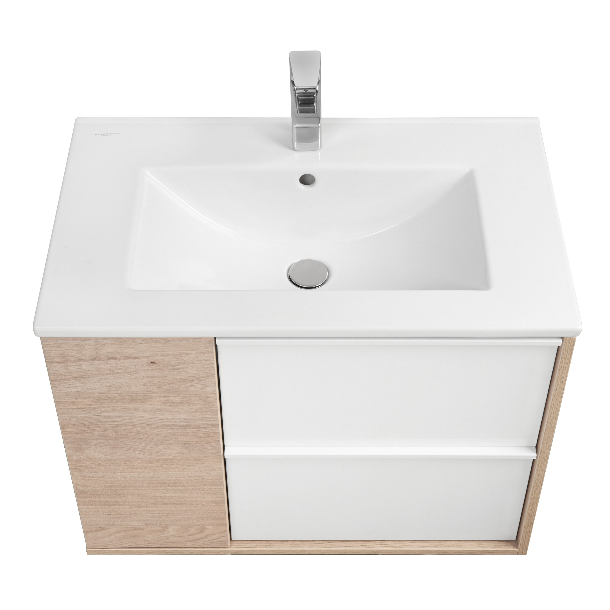 Дизайн элегантной и вместительной тумбы Бостон 75 от AQUATON в современном стиле сочетает в себе два цвета отделки - белоснежный глянец и древесный декор под натуральное дерево. Выполненная из влагостойкой ламинированной плиты тумба обладает простым и удобным функционалом. Слева за распашным фасадом-створкой находится отделение с регулируемой по высоте стеклянной полкой. Справа расположены белоснежные фасады, которые открываются с помощью профильной ручки от европейского производителя. Удобство и комфорт при использовании обеспечивают ящики и петли с доводчиками. Тумба комплектуется прямоугольной керамической раковиной Квадро.