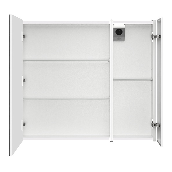 Зеркальный шкаф Ондина 80 от бренда AQUATON создан для тех, кто ценит лаконичный современный дизайн.  Корпус из влагостойкой ЛДСП и фасад из МДФ, покрытые белой глянцевой краской, устойчивы к влаге и долго сохраняют безупречный внешний вид, Вместительный шкаф разделен на две секции, каждая из которых оборудована стеклянными полками. Также модель оснащена подсветкой и дополнительной розеткой. Плавное закрывание фасадов-створок обеспечивают петли с доводчиками. Зеркальный шкаф идеально сочетается с тумбой под раковину AQUATON Ондина 80 в белом цвете.