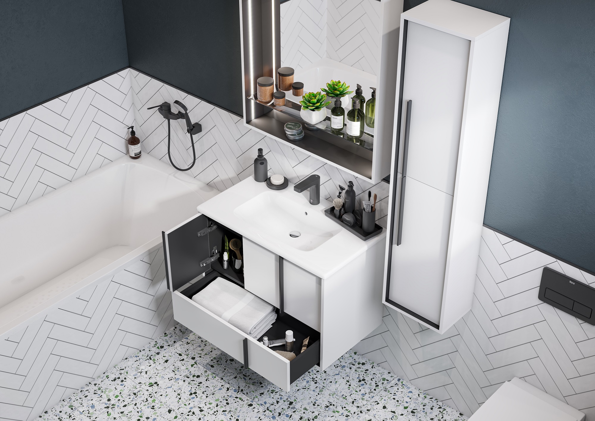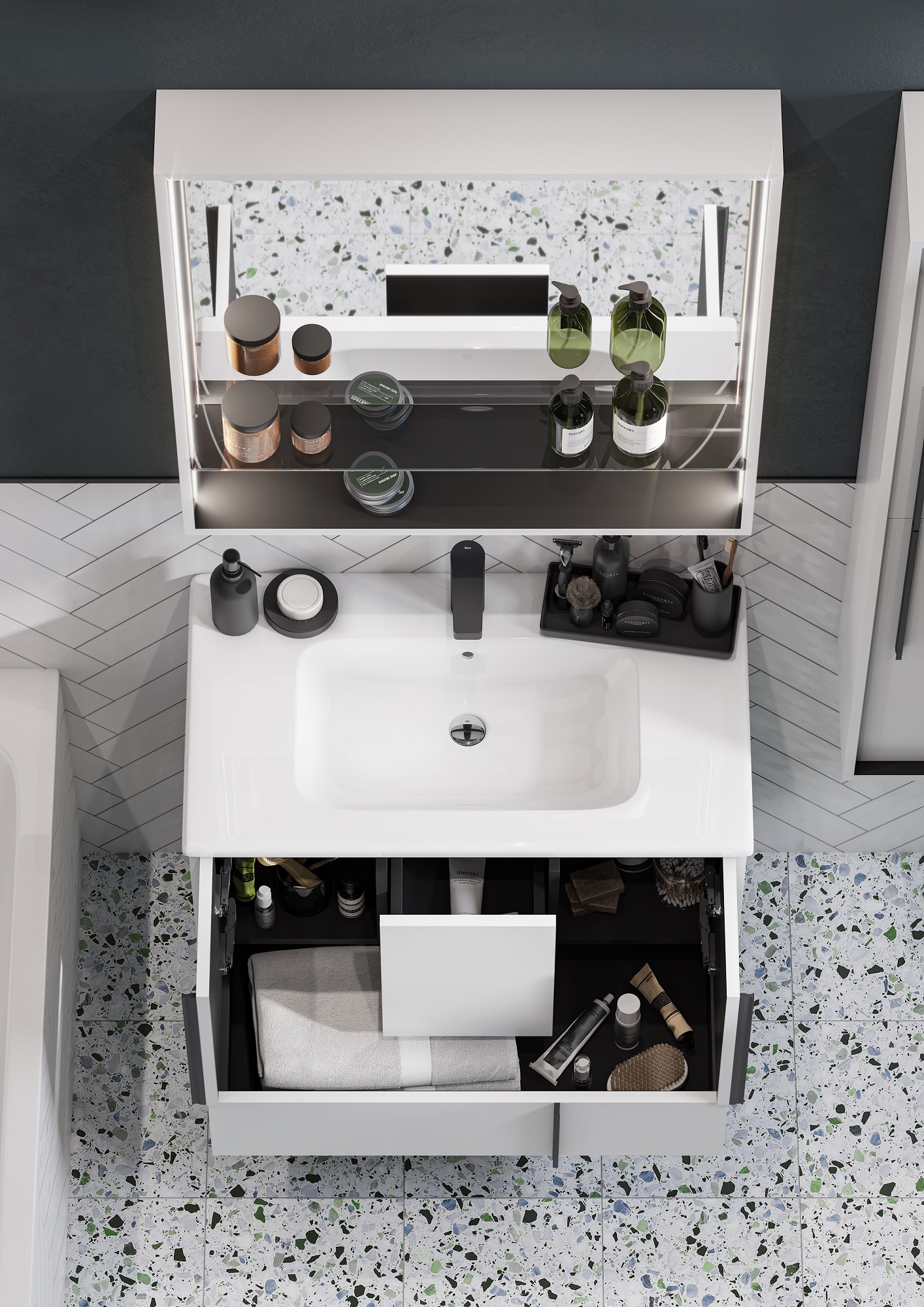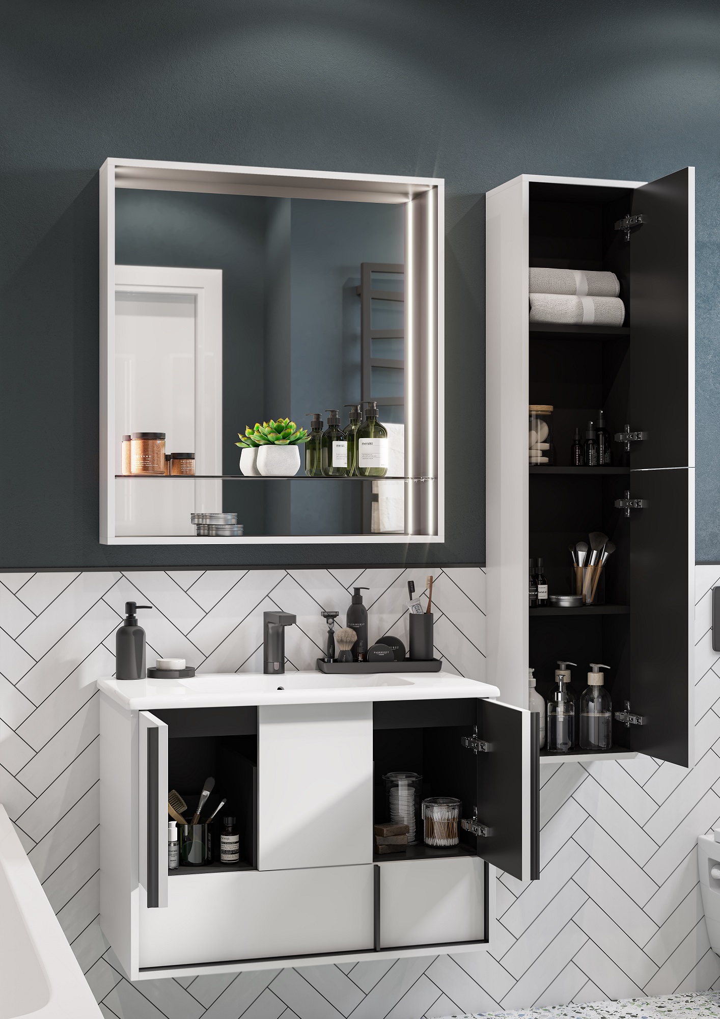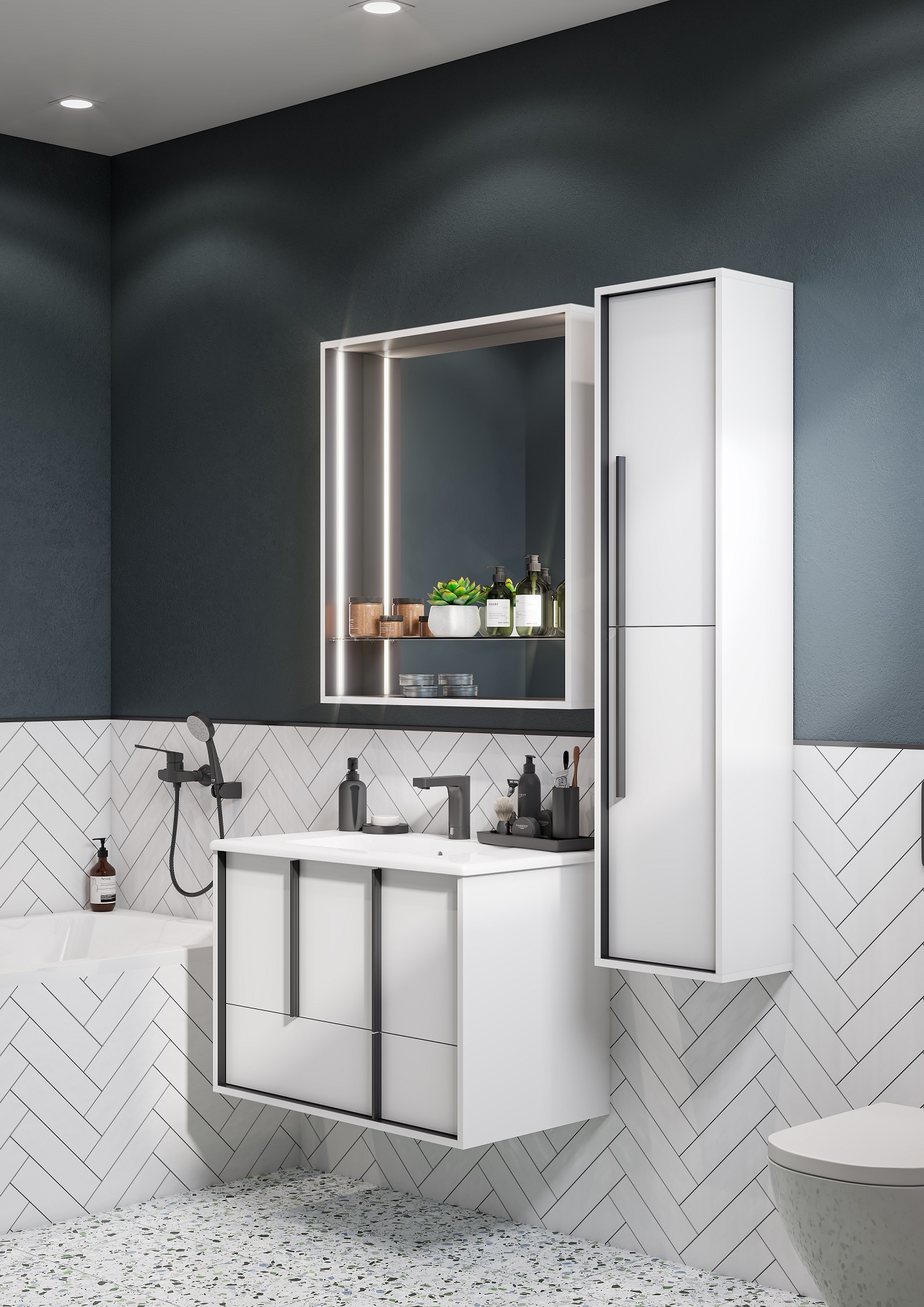 Корпус зеркального шкафа Ривьера 80 от бренда AQUATON выполнен из чёрной МДФ в белой матовой пленке, что позволяет создать яркий цветовой контраст чёрного и белого. Плёнка позволяет надежно защитить мебель от воздействия влажной среды ванной комнаты. В боковые стенки интегрированы LED-светильники. Зеркальный шкаф комплектуется полкой из затемнённого стекла с фиксаторами, которые помогут избежать случайного опрокидывания. Практичная и функциональная модель идеально дополнит тумбу под раковину AQUATON Ривьера 80.