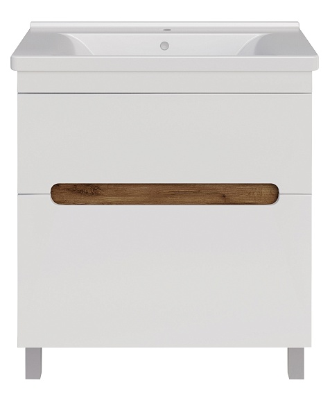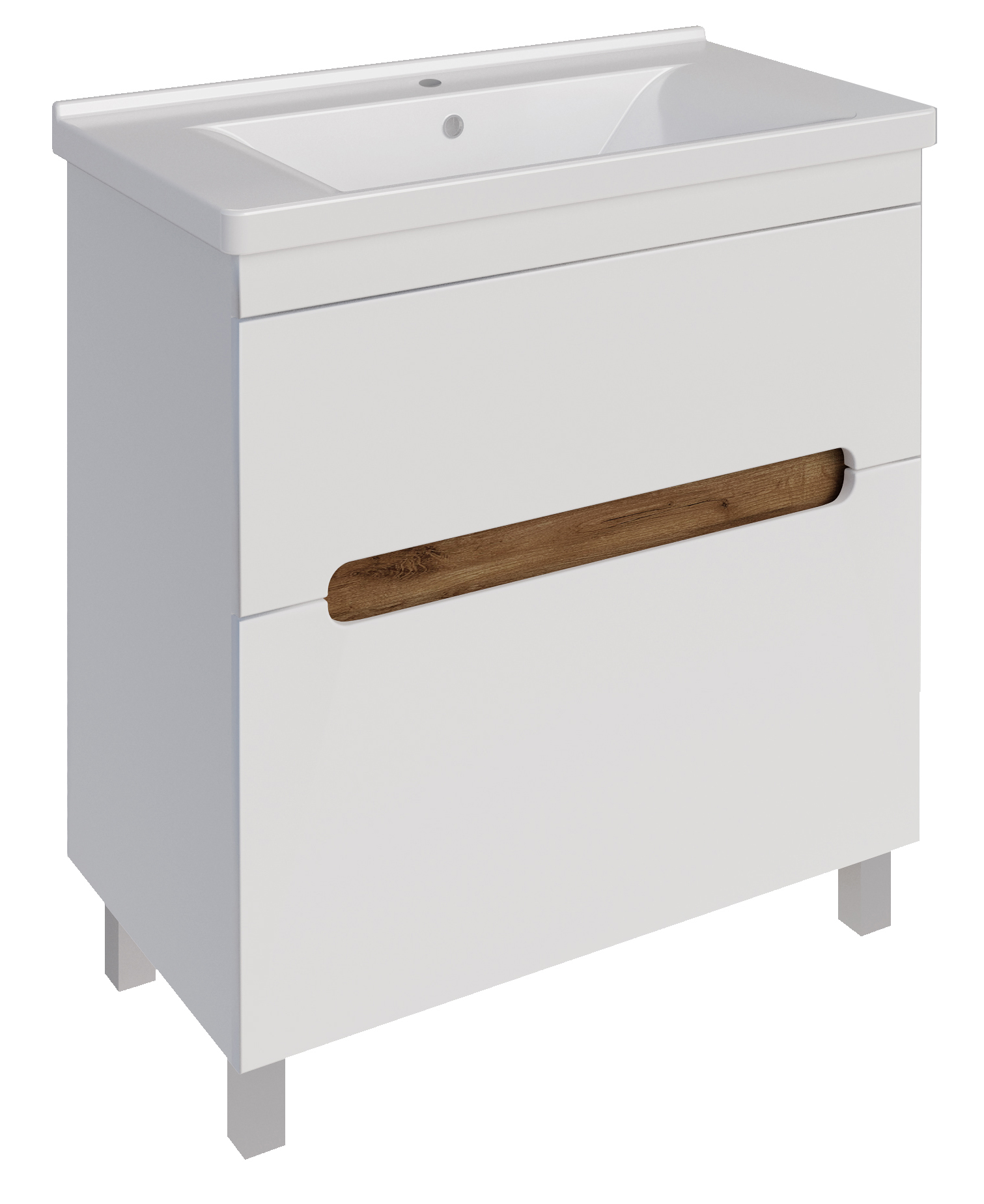 изготовлены из МДФ и покрыты глянцевой эмалью. Корпус изготовлен из ЛДСП, внутренние элементы имитируют натуральое дерево. Ручка интегрирована в фасады тумбы