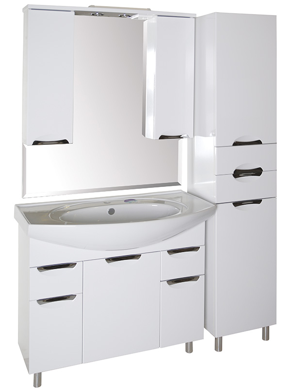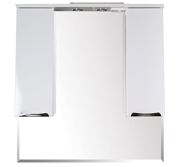 Влагостойкая зеркальное полотно с козырьком со встроенной галогеновой подсветкой и выключателем с розеткой. С двух сторон от зеркала расположены шкафчики с распашными дверцами, внутренними полками. Покрытие фасада и корпуса - глянцевое, пленка.