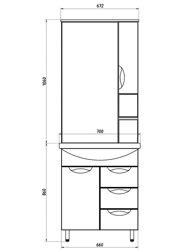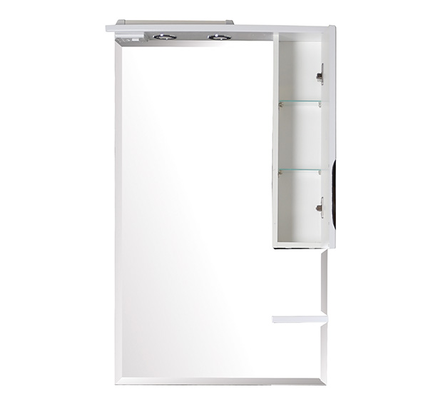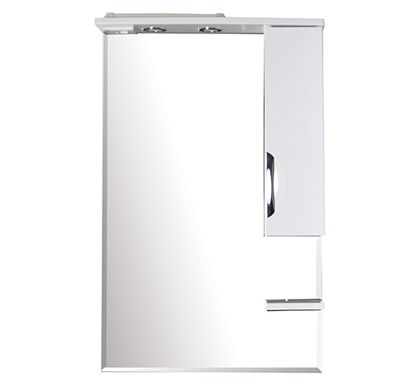 Влагостойкое зеркальное полотно, справа шкафчик с распашной дверцей с доводчиками, полочка нижняя, встроенные в карниз светильники, розетка и выключатель.