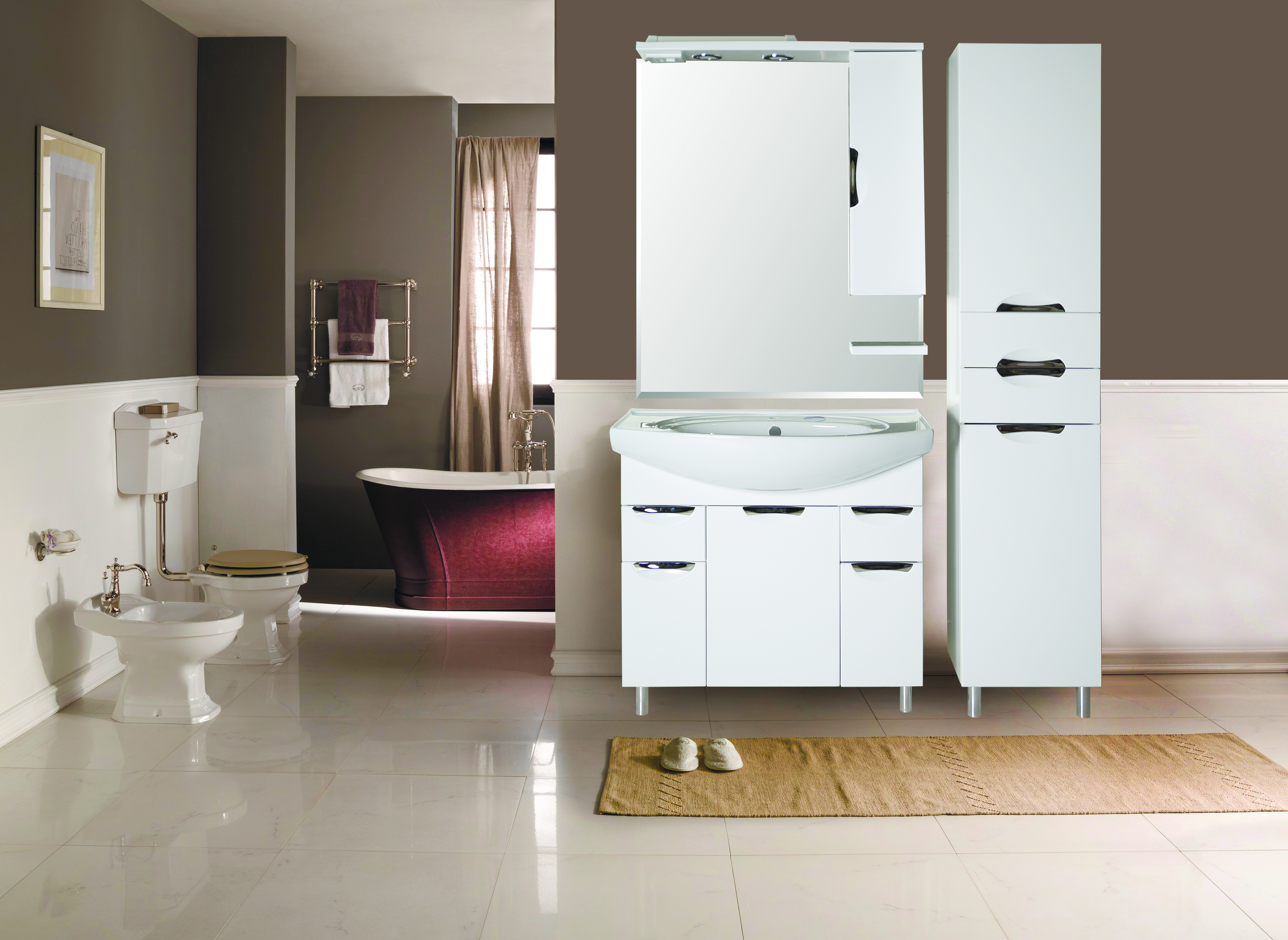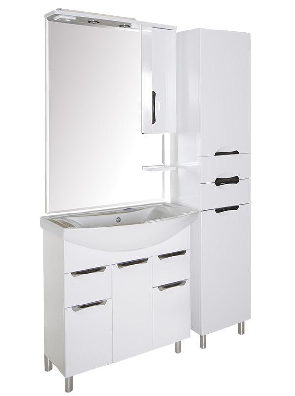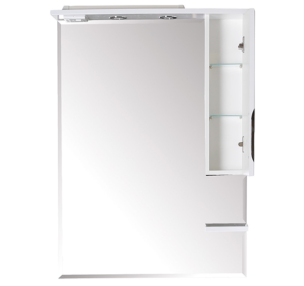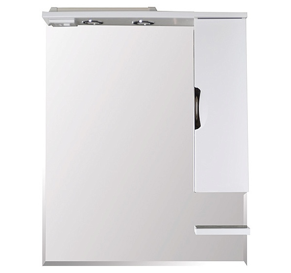 Влагостойкое зеркальное полотно, справа шкафчик с распашной дверцей с доводчиками, полочка нижняя, встроенные в карниз светильники, розетка и выключатель.