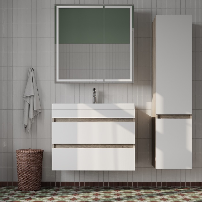 • Светодиодная подсветка дает приятный фронтальный свет и скрадывает габариты шкафа, делая его более эстетичным. Механический выключатель спрятан на торце под зеркалом. Это удобно, надежно и убережет зеркало от лишних отпечатков.