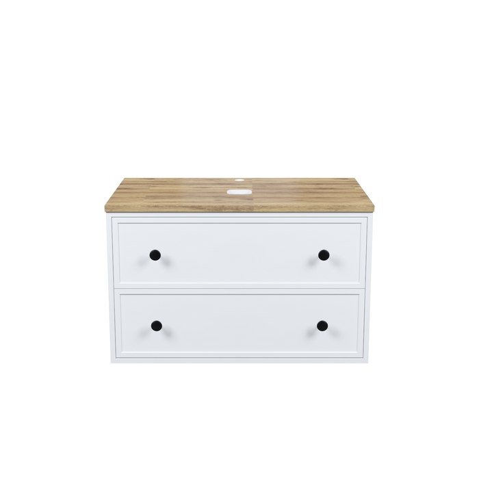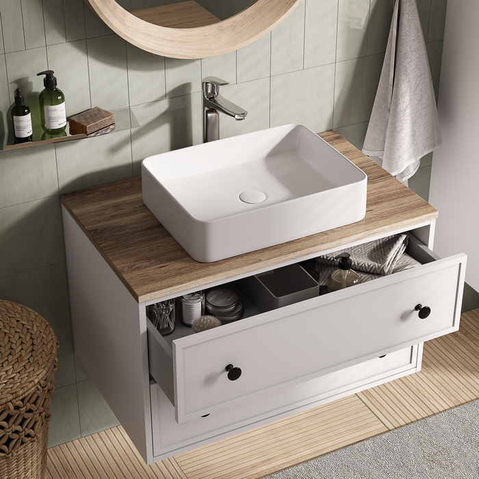 Вместительная подвесная тумба Torr классического молочно-белого цвета со столешницей из клееного натурального дуба. Сочетает в себе узнаваемый стиль и практичность популярного скандинавского дизайна. Ее четкие формы, теплый цвет дерева, фасады с декоративной филенкой, круглые ручки смотрятся гармонично и впишутся в любой современный интерьер. Подойдет любой накладной умывальник, покупается отдельно. • Два просторных выдвижных ящика закрываются плавно и бесшумно благодаря высококачественным скрытым направляющим с доводчиками Hettich. Внутри ящики графитового цвета – стильно и практично. • Многослойное покрытие матовой эмалью, предназначенной для использования в помещениях с высокой влажностью, позволит сохранить первоначальный вид мебели надолго (при должном уходе). • Надежная фурнитура Hettich рассчитана на 30 000 открываний – это более 10 лет исправной работы. Гарантия на мебель IDDIS® – 3 года. (с) Авторский текст, сентябрь 2023 г.