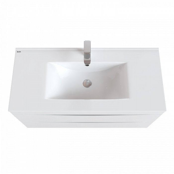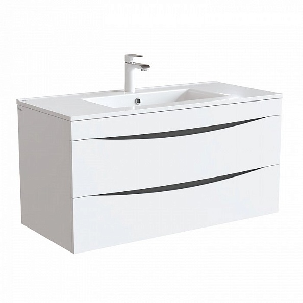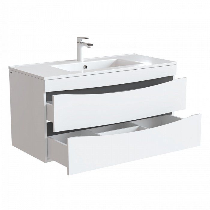 Тумба с умывальником для ванной комнаты, подвесная. Ширина 100 см. Фасад МДФ в эмали, боковины ЛДСП. Два ящика,интегрированные ручки, перекатной организатор, пластиковый ограничитель под сифон. Плоский керамический умывальник. Упаковка: картон, пленка, пенопластовые уголки.