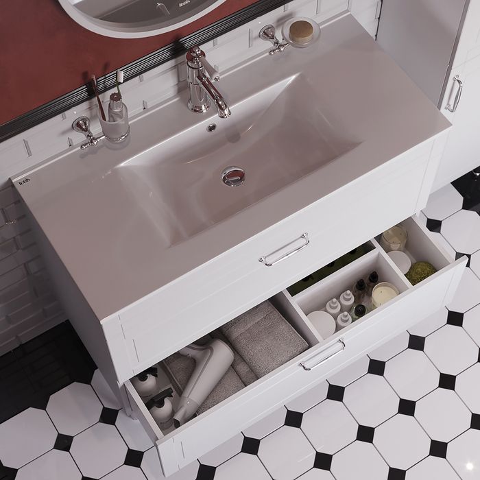 Вместительная (ширина 100 мм) напольная тумба из коллекции Oxford – модное сочетание классического стиля со стилем ретро. Коллекция органично впишется в любой интерьер благодаря сбалансированному дизайну и элегантному фрезерованному фасаду. Полированные ножки и ручки тумбы не только гармонично дополняют белый полуматовый фасад, но и поддерживают дизайн смесителей IDDIS® коллекции Oxford. Что позволит оформить пространство ванной в едином стиле без дополнительных временных затрат. Плоский эргономичный умывальник идет в комплекте.