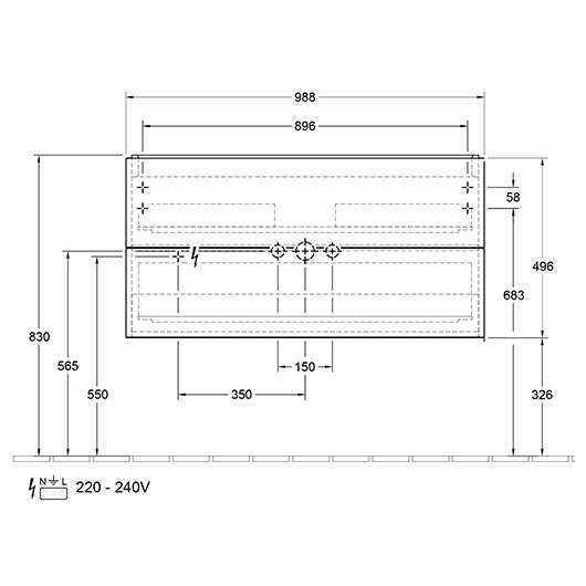 • Оснащение: 1 компактный сифон, 1 внутренняя подсветка выдвижных ящиков, 2 выдвижных ящика с антискользящим дном