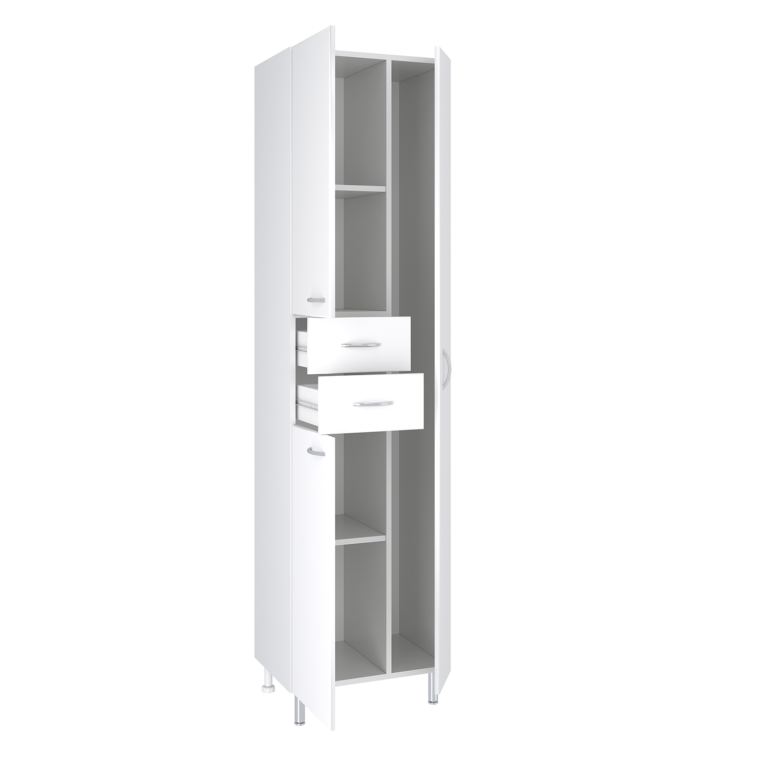 Шкаф-колонна напольный, справа - отделение для халатов с распашной дверью, слева -две дверцы и два выдвижных ящика. В нижнем и верхнем отделениях - по одной внутренней полке. Ящики - на шариковых направляющих, петли со встроенным доводчиком, ручки - 5шт, крючок - 1шт, ножки хром - 2 шт, ножки пластик -2шт. Выпускается только в правом исполнении