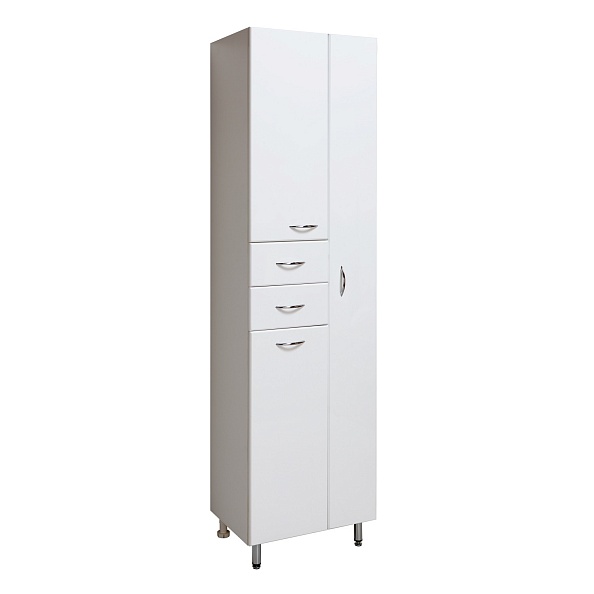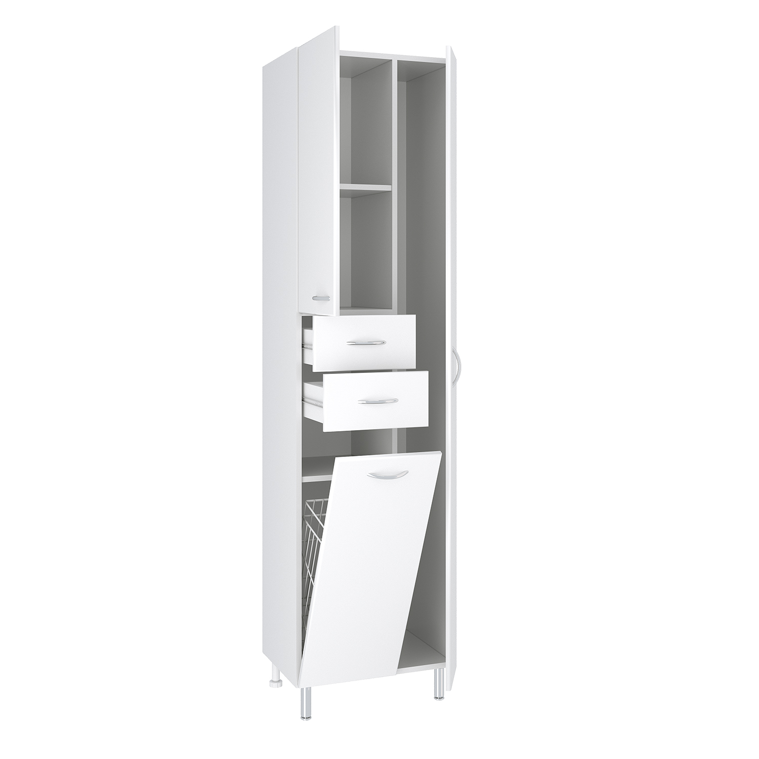 Шкаф-колонна напольный, справа - отделение для халатов с распашной дверью, слева - две дверцы и два выдвижных ящика. Верхнее отделение с распашной дверкой и одной внутренней полкой. Нижнее отделение - с откидной дверью и корзиной для белья. Ящики - на шариковых направляющих, петли со встроенным доводчиком, ручки - 5шт, крючок - 1шт, ножки хром - 2 шт, ножки пластик -2шт. Выпускается только в правом исполнении