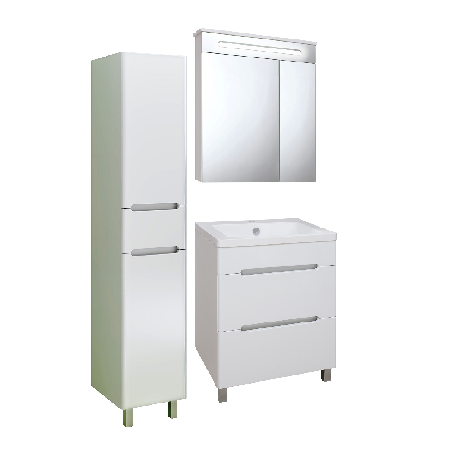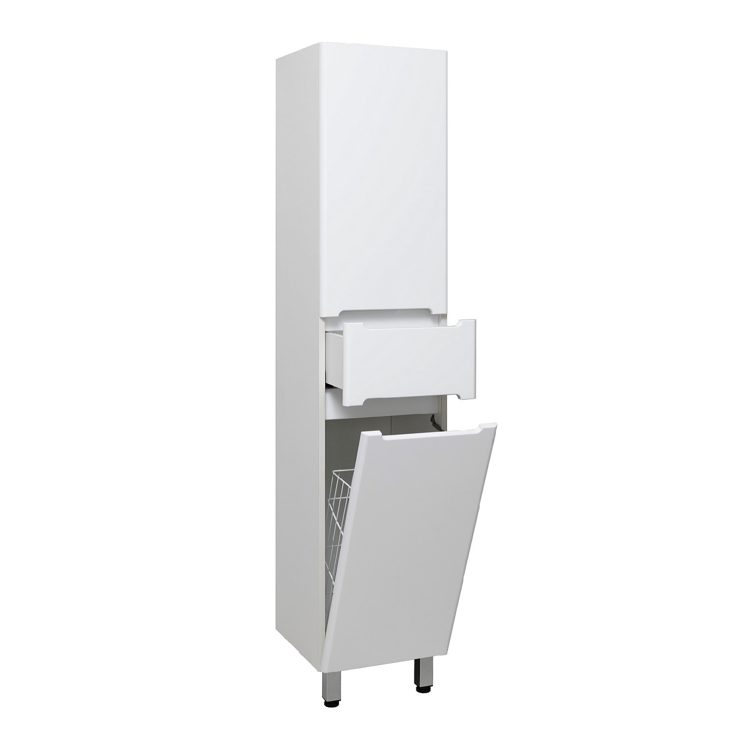Шкаф-колонна напольный/подвесной с двумя дверками и выдвижным ящиком на шариковых направляющих скрытого монтажа с доводчиком. Верхнее отделение - с распашной дверью (петли справа) и одной внутренней полкой. Нижнее отделение - с откидной дверкой и корзиной для белья. Петли со встроенным доводчиком, навесы - 2шт, ножки хром - 2шт, ножки пластик -2шт. Выпускается только в правом исполнении.