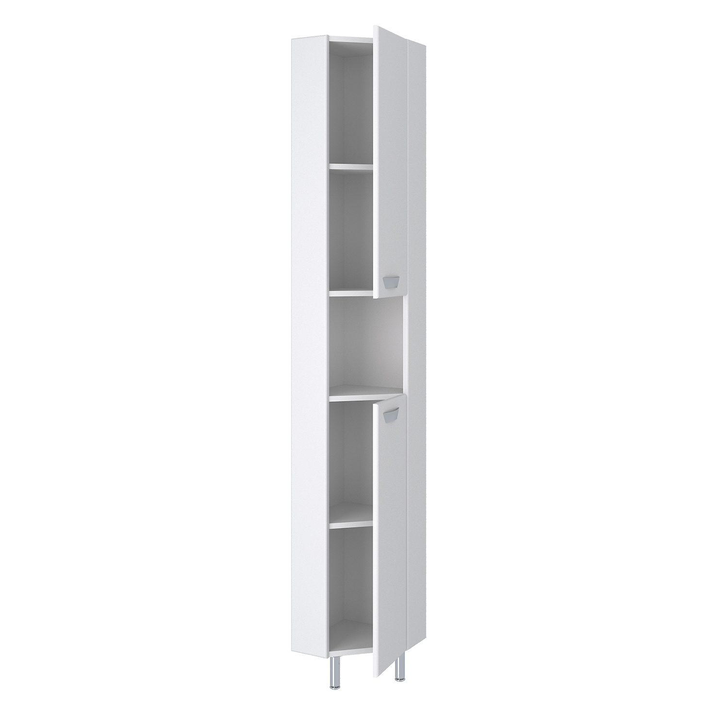 Шкаф-колонна угловой с двумя распашными дверками и открытой нишей посередине. В нижнем и верхнем отделениях - по одной внутренней полке. Петли со встроенным доводчиком, ручки - 2шт, ножки хром - 2 шт, ножка пластик -1шт. Универсальный.