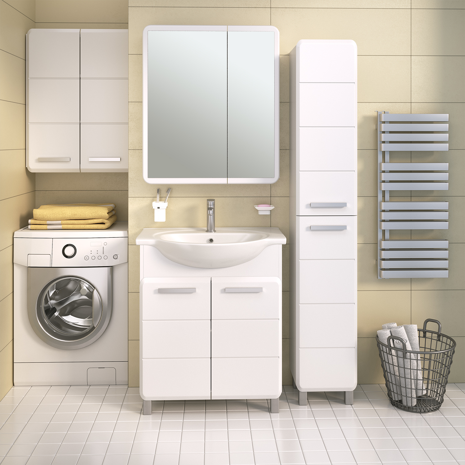 Шкаф-колонна напольный универсальный с двумя распашными дверками. В верхнем и нижнем отделениях - по две внутренние полки. Петли со встроенным доводчиком. Ручки- 2шт, ножки хром - 2 шт, ножки пластик - 2шт.
