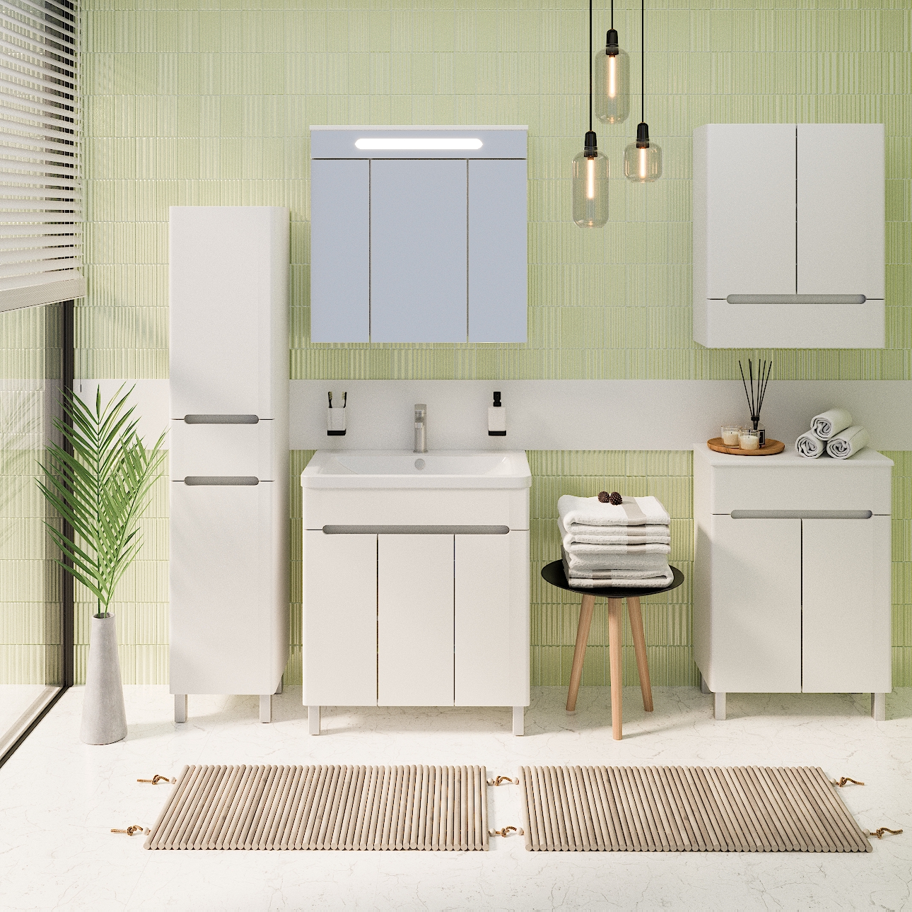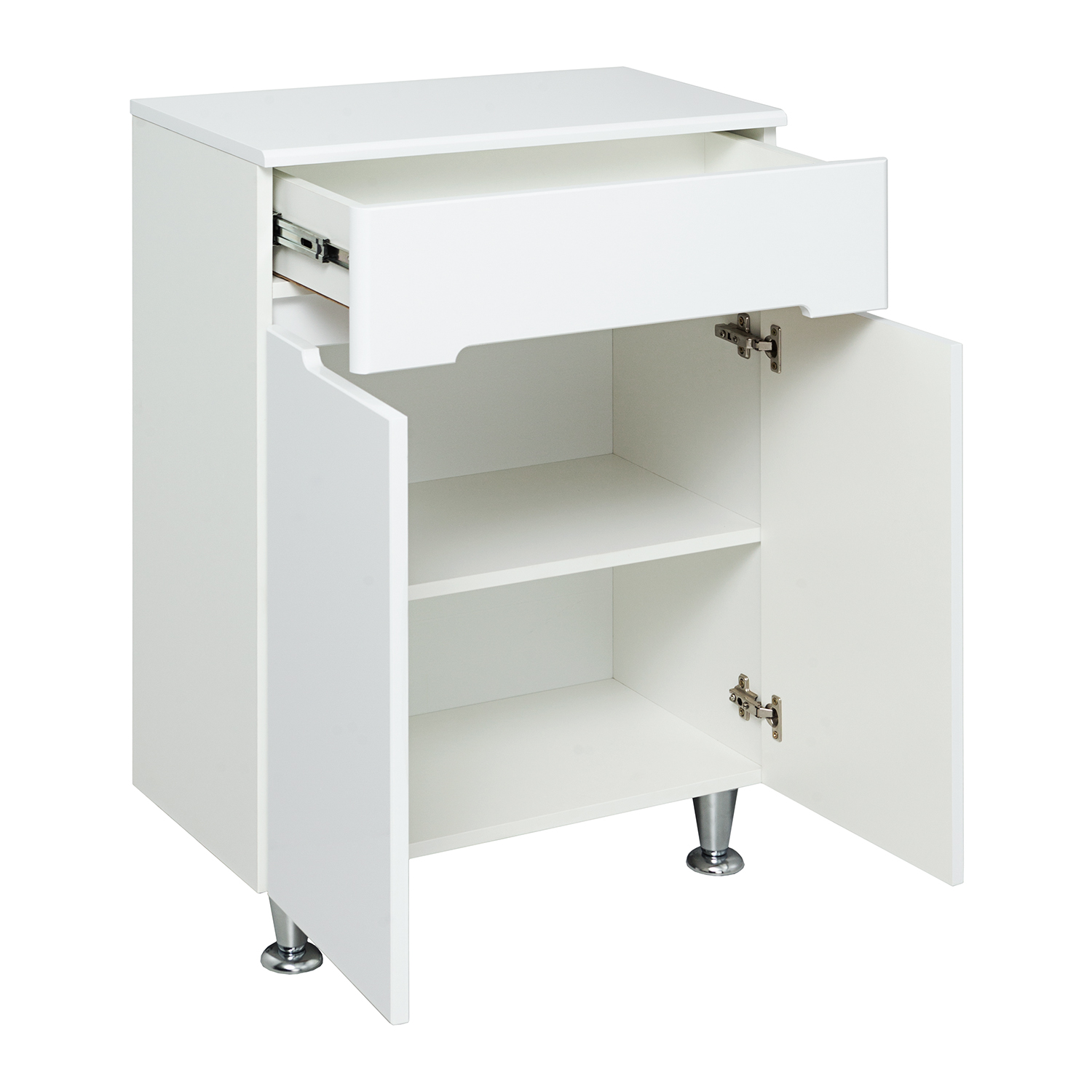 Тумба в ванную (полупенал) с одним выдвижным ящиком и двумя распашными дверками. В нижнем отделении - одна внутренняя полка. Петли со встроенным доводчиком, ящик на шариковых направляющих полного выдвижения.