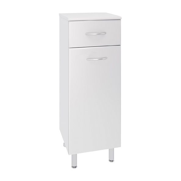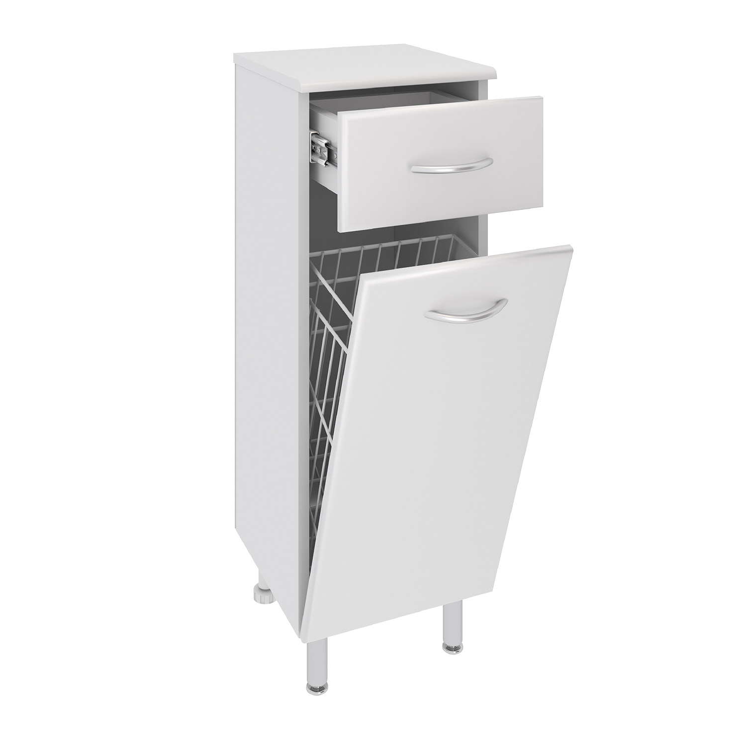 Тумба в ванную (полупенал) с одним выдвижным ящиком и откидной дверью. Нижнее отделение комплектуется одной внутренней полкой и корзиной для белья. Ящик - на шариковых направляющих, петли со встроенным доводчиком, ручки - 2шт, ножки хром - 2 шт, ножки пластик -2шт.