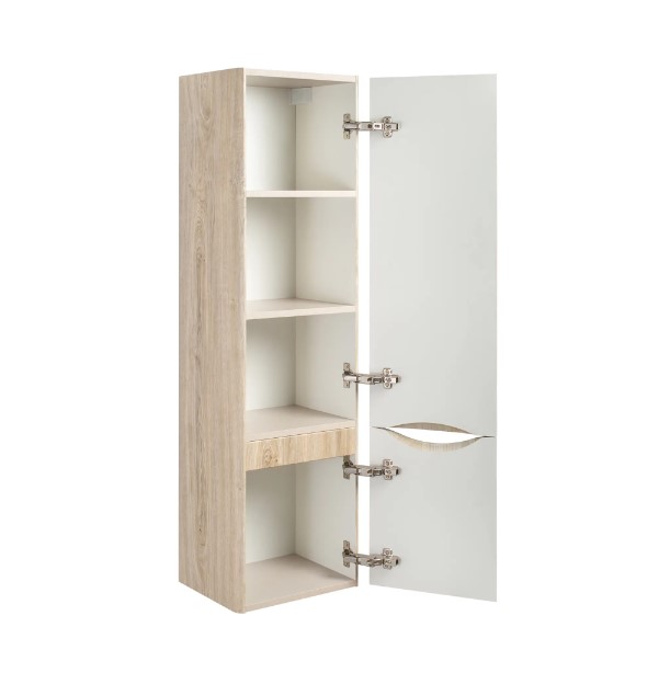 Шкаф пенал для ванной комнаты Runo Тоскана (подвесной) - выполнена в ультрасовременном дизайне в цвете светлое дерево. Пенал отличается изысканным дизайном, скруглённые углы, древесная текстура фасада, врезная ручка – придают шкафу необычный и незабываемый внешний вид. Шкаф в ванную комнату оснащён двумя распашными дверцами, в верхнем отделении две встроенные полки. Каждая дверца укомплектована двумя петлями, верхняя с доводчиком, нижняя без доводчика. Мебель для ванной RUNO - красота и практичность в мелочах!